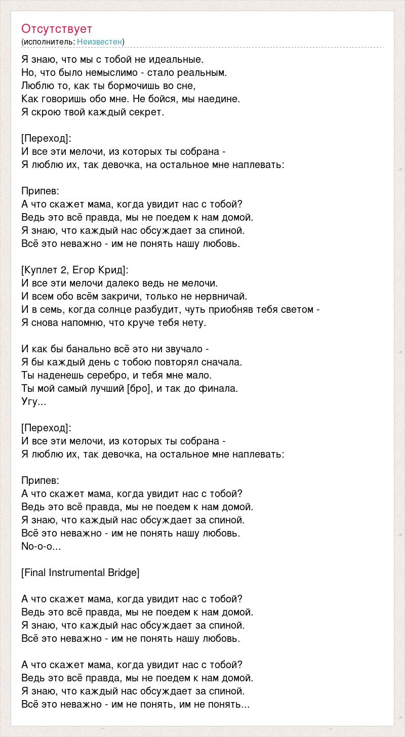 Я знаю, что мы с тобой не идеальные. Но, что было немыслимо - стало реальным. Люблю то, как ты бормочишь во сне, Как говоришь обо мне. Не бойся, мы наедине. Я скрою твой каждый секрет. [Переход]: И все эти мелочи, из которых ты собрана - Я люблю их, так девочка, на остальное мне наплевать: Припев: А что скажет мама, когда увидит нас с тобой? Ведь это всё правда, мы не поедем к нам домой. Я знаю, что каждый нас обсуждает за спиной. Всё это неважно - им не понять нашу любовь. [Куплет 2, Егор Крид]: И все эти мелочи далеко ведь не мелочи. И всем обо всём закричи, только не нервничай. И в семь, когда солнце разбудит, чуть приобняв тебя светом - Я снова напомню, что круче тебя нету. И как бы банально всё это ни звучало - Я бы каждый день с тобою повторял сначала. Ты наденешь серебро, и тебя мне мало. Ты мой самый лучший [бро], и так до финала. Угу... [Переход]: И все эти мелочи, из которых ты собрана - Я люблю их, так девочка, на остальное мне наплевать: Припев: А что скажет мама, когда увидит нас с тобой? Ведь это всё правда, мы не поедем к нам домой. Я знаю, что каждый нас обсуждает за спиной. Всё это неважно - им не понять нашу любовь. No-o-o... [Final Instrumental Bridge] А что скажет мама, когда увидит нас с тобой? Ведь это всё правда, мы не поедем к нам домой. Я знаю, что каждый нас обсуждает за спиной. Всё это неважно - им не понять нашу любовь. А что скажет мама, когда увидит нас с тобой? Ведь это всё правда, мы не поедем к нам домой. Я знаю, что каждый нас обсуждает за спиной. Всё это неважно - им не понять, им не понять...