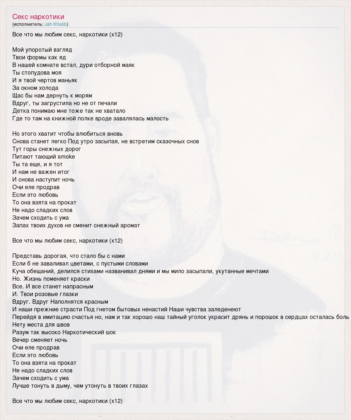 Все что мы любим секс, наркотики (х12) Мой упоротый взгляд Твои формы как яд В нашей комнате встал, дури отборной маяк Ты стопудова моя И я твой чертов маньяк За окном холода Щас бы нам дернуть к морям Вдруг, ты загрустила но не от печали Детка понимаю мне тоже так не хватало Где то там на книжной полке вроде завалялась малость Но этого хватит чтобы влюбиться вновь Снова станет легко Под утро засыпая, не встретим сказочных снов Тут горы снежных дорог Питают тающий smoke Ты та еще, и я тот И нам не важен итог И снова наступит ночь Очи еле продрав Если это любовь То она взята на прокат Не надо сладких слов Зачем сходить с ума Запах твоих духов не сменит снежный аромат Все что мы любим секс, наркотики (х12) Представь дорогая, что стало бы с нами Если б не заваливал цветами, с пустыми словами Куча обещаний, делился стихами названивал днями и мы мило засыпали, укутанные мечтами Но. Жизнь поменяет краски Все. И все станет напрасным И. Твои розовые глазки Вдруг. Вдруг Наполнятся красным И наши прежние страсти Под гнетом бытовых ненастий Наши чувства заледенеют Перейдя в имитацию счастья но, нам и так хорошо наш тайный уголок украсит дрянь и порошок в сердцах осталась боль Нету места для швов Разум так высоко Наркотический шок Вечер сменяет ночь Очи еле продрав Если это любовь То она взята на прокат Не надо сладких слов Зачем сходить с ума Лучше тонуть в дыму, чем утонуть в твоих глазах Все что мы любим секс, наркотики (х12)