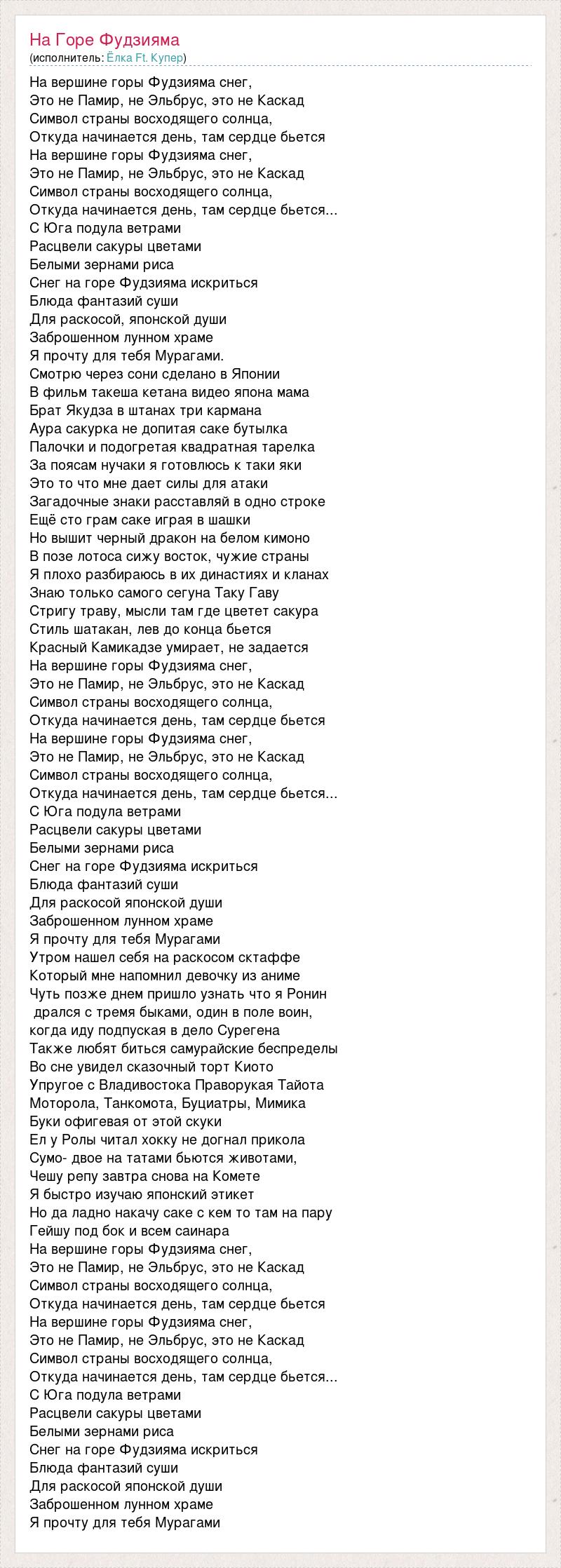 На вершине горы Фудзияма снег, Это не Памир, не Эльбрус, это не Каскад Символ страны восходящего солнца, Откуда начинается день, там сердце бьется На вершине горы Фудзияма снег, Это не Памир, не Эльбрус, это не Каскад Символ страны восходящего солнца, Откуда начинается день, там сердце бьется... С Юга подула ветрами Расцвели сакуры цветами Белыми зернами риса Снег на горе Фудзияма искриться Блюда фантазий суши Для раскосой, японской души Заброшенном лунном храме Я прочту для тебя Мурагами. Смотрю через сони сделано в Японии В фильм такеша кетана видео япона мама Брат Якудза в штанах три кармана Аура сакурка не допитая саке бутылка Палочки и подогретая квадратная тарелка За поясам нучаки я готовлюсь к таки яки Это то что мне дает силы для атаки Загадочные знаки расставляй в одно строке Ещё сто грам саке играя в шашки Но вышит черный дракон на белом кимоно В позе лотоса сижу восток, чужие страны Я плохо разбираюсь в их династиях и кланах Знаю только самого сегуна Таку Гаву Стригу траву, мысли там где цветет сакура Стиль шатакан, лев до конца бьется Красный Камикадзе умирает, не задается На вершине горы Фудзияма снег, Это не Памир, не Эльбрус, это не Каскад Символ страны восходящего солнца, Откуда начинается день, там сердце бьется На вершине горы Фудзияма снег, Это не Памир, не Эльбрус, это не Каскад Символ страны восходящего солнца, Откуда начинается день, там сердце бьется... С Юга подула ветрами Расцвели сакуры цветами Белыми зернами риса Снег на горе Фудзияма искриться Блюда фантазий суши Для раскосой японской души Заброшенном лунном храме Я прочту для тебя Мурагами Утром нашел себя на раскосом сктаффе Который мне напомнил девочку из аниме Чуть позже днем пришло узнать что я Ронин дрался с тремя быками, один в поле воин, когда иду подпуская в дело Сурегена Также любят биться самурайские беспределы Во сне увидел сказочный торт Киото Упругое с Владивостока Праворукая Тайота Моторола, Танкомота, Буциатры, Мимика Буки офигевая от этой скуки Ел у Ролы читал хокку не догнал прикола Сумо- двое на татами бьются животами, Чешу репу завтра снова на Комете Я быстро изучаю японский этикет Но да ладно накачу саке с кем то там на пару Гейшу под бок и всем саинара На вершине горы Фудзияма снег, Это не Памир, не Эльбрус, это не Каскад Символ страны восходящего солнца, Откуда начинается день, там сердце бьется На вершине горы Фудзияма снег, Это не Памир, не Эльбрус, это не Каскад Символ страны восходящего солнца, Откуда начинается день, там сердце бьется... С Юга подула ветрами Расцвели сакуры цветами Белыми зернами риса Снег на горе Фудзияма искриться Блюда фантазий суши Для раскосой японской души Заброшенном лунном храме Я прочту для тебя Мурагами
