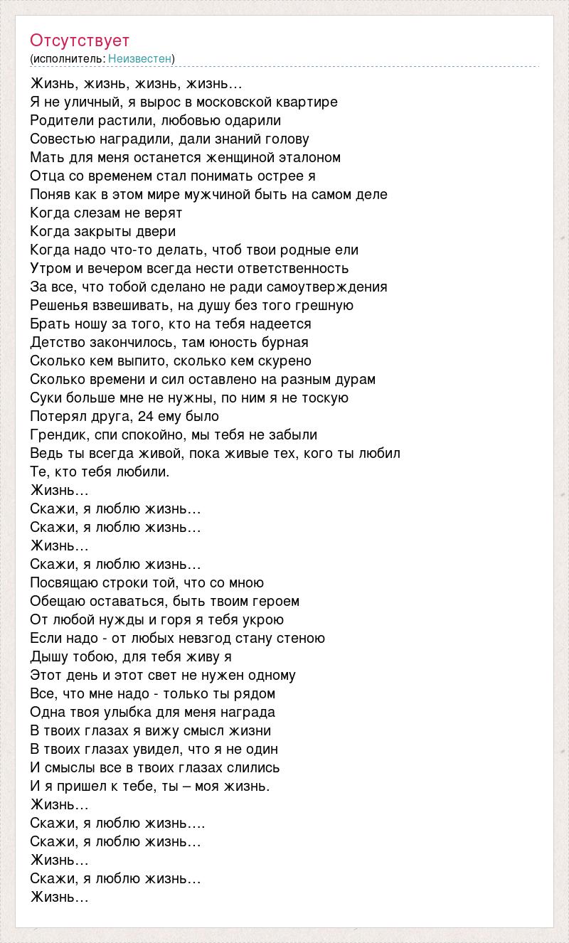 Жизнь, жизнь, жизнь, жизнь… Я не уличный, я вырос в московской квартире Родители растили, любовью одарили Совестью наградили, дали знаний голову Мать для меня останется женщиной эталоном Отца со временем стал понимать острее я Поняв как в этом мире мужчиной быть на самом деле Когда слезам не верят Когда закрыты двери Когда надо что-то делать, чтоб твои родные ели Утром и вечером всегда нести ответственность За все, что тобой сделано не ради самоутверждения Решенья взвешивать, на душу без того грешную Брать ношу за того, кто на тебя надеется Детство закончилось, там юность бурная Сколько кем выпито, сколько кем скурено Сколько времени и сил оставлено на разным дурам Суки больше мне не нужны, по ним я не тоскую Потерял друга, 24 ему было Грендик, спи спокойно, мы тебя не забыли Ведь ты всегда живой, пока живые тех, кого ты любил Те, кто тебя любили. Жизнь… Скажи, я люблю жизнь… Скажи, я люблю жизнь… Жизнь… Скажи, я люблю жизнь… Посвящаю строки той, что со мною Обещаю оставаться, быть твоим героем От любой нужды и горя я тебя укрою Если надо - от любых невзгод стану стеною Дышу тобою, для тебя живу я Этот день и этот свет не нужен одному Все, что мне надо - только ты рядом Одна твоя улыбка для меня награда В твоих глазах я вижу смысл жизни В твоих глазах увидел, что я не один И смыслы все в твоих глазах слились И я пришел к тебе, ты – моя жизнь. Жизнь… Скажи, я люблю жизнь…. Скажи, я люблю жизнь… Жизнь… Скажи, я люблю жизнь… Жизнь…