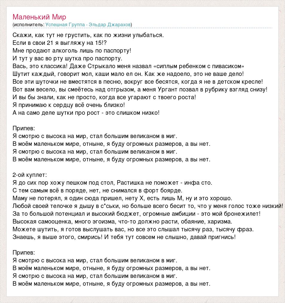 Скажи, как тут не грустить, как по жизни улыбаться. Если в свои 21 я выгляжу на 15!? Мне продают алкоголь лишь по паспорту! И тут у вас во рту шутка про паспорту. Вась, это классика! Даже Стрыкало меня назвал «сиплым ребенком с пивасиком» Шутит каждый, говорит мол, каши мало ел он. Как же надоело, это не ваше дело! Все эти шуточки не вместятся в песню, вокруг все бесятся, когда я не в детском кресле! Вот вам весело, вы смеётесь над отгрызом, а меня Ургант позвал в рубрику взгляд снизу! И вы бы знали, как не просто, когда все угарают с твоего роста! Я принимаю к сердцу всё очень близко! А на само деле шутки про рост - это слишком низко! Припев: Я смотрю с высока на мир, стал большим великаном в миг. В моём маленьком мире, отныне, я буду огромных размеров, а вы нет. Я смотрю с высока на мир, стал большим великаном в миг. В моём маленьком мире, отныне, я буду огромных размеров, а вы нет. 2-ой куплет: Я до сих пор хожу пешком под стол, Растишка не поможет - инфа сто. С тем самым всё в поряде, нет, не снимался в форт боярде. Маму не потерял, я один сюда пришел, нету Х, есть лишь М, ну и это хорошо. Любой своей телочке я дышу в с*ськи, но больше всего бесит то, что у меня голос тоже низкий! За то большой потенциал и высокий бюджет, огромные амбиции - это мой бронежилет! Высокая самооценка, много эгоизма, что-то должно расти, обаяние, харизма. Можете шутить, я готов выслушать вас, но все это слышал тысячу раз, тысячу фраз. Знаешь, я выше этого, смирись! И тебя тут совсем не слышно, давай пригнись! Припев: Я смотрю с высока на мир, стал большим великаном в миг. В моём маленьком мире, отныне, я буду огромных размеров, а вы нет. Я смотрю с высока на мир, стал большим великаном в миг. В моём маленьком мире, отныне, я буду огромных размеров, а вы нет.