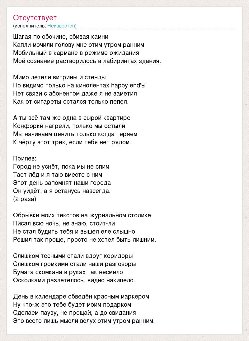 Шагая по обочине, сбивая камни Капли мочили голову мне этим утром ранним Мобильный в кармане в режиме ожидания Моё сознание растворилось в лабиринтах здания. Мимо летели витрины и стенды Но видимо только на кинолентах happy end'ы Нет связи с абонентом даже я не заметил Как от сигареты остался только пепел. А ты всё там же одна в сырой квартире Конфорки нагрели, только мы остыли Мы начинаем ценить только когда теряем К чёрту этот трек, если тебя нет рядом. Припев: Город не уснёт, пока мы не спим Тает лёд и я таю вместе с ним Этот день запомнят наши города Он уйдёт, а я останусь навсегда. (2 раза) Обрывки моих текстов на журнальном столике Писал всю ночь, не знаю, стоит-ли Не стал будить тебя и вышел еле слышно Решил так проще, просто не хотел быть лишним. Слишком тесными стали вдруг коридоры Слишком громкими стали наши разговоры Бумага скомкана в руках так несмело Осколками разлетелось, видно накипело. День в календаре обведён красным маркером Ну что-ж это тебе будет моим подарком Сделаем паузу, не прощай, а до свидания Это всего лишь мысли вслух этим утром ранним.
