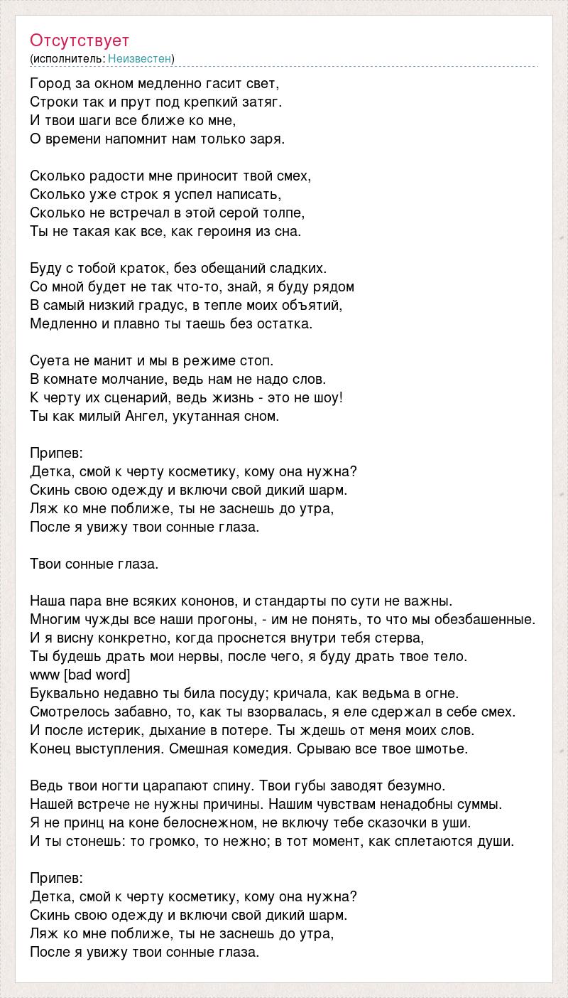 Город за окном медленно гасит свет, Строки так и прут под крепкий затяг. И твои шаги все ближе ко мне, О времени напомнит нам только заря. Сколько радости мне приносит твой смех, Сколько уже строк я успел написать, Сколько не встречал в этой серой толпе, Ты не такая как все, как героиня из сна. Буду с тобой краток, без обещаний сладких. Со мной будет не так что-то, знай, я буду рядом В самый низкий градус, в тепле моих объятий, Медленно и плавно ты таешь без остатка. Суета не манит и мы в режиме стоп. В комнате молчание, ведь нам не надо слов. К черту их сценарий, ведь жизнь - это не шоу! Ты как милый Ангел, укутанная сном. Припев: Детка, смой к черту косметику, кому она нужна? Скинь свою одежду и включи свой дикий шарм. Ляж ко мне поближе, ты не заснешь до утра, После я увижу твои сонные глаза. Твои сонные глаза. Наша пара вне всяких кононов, и стандарты по сути не важны. Многим чужды все наши прогоны, - им не понять, то что мы обезбашенные. И я висну конкретно, когда проснется внутри тебя стерва, Ты будешь драть мои нервы, после чего, я буду драть твое тело. www [bad word] Буквально недавно ты била посуду; кричала, как ведьма в огне. Смотрелось забавно, то, как ты взорвалась, я еле сдержал в себе смех. И после истерик, дыхание в потере. Ты ждешь от меня моих слов. Конец выступления. Смешная комедия. Срываю все твое шмотье. Ведь твои ногти царапают спину. Твои губы заводят безумно. Нашей встрече не нужны причины. Нашим чувствам ненадобны суммы. Я не принц на коне белоснежном, не включу тебе сказочки в уши. И ты стонешь: то громко, то нежно; в тот момент, как сплетаются души. Припев: Детка, смой к черту косметику, кому она нужна? Скинь свою одежду и включи свой дикий шарм. Ляж ко мне поближе, ты не заснешь до утра, После я увижу твои сонные глаза.