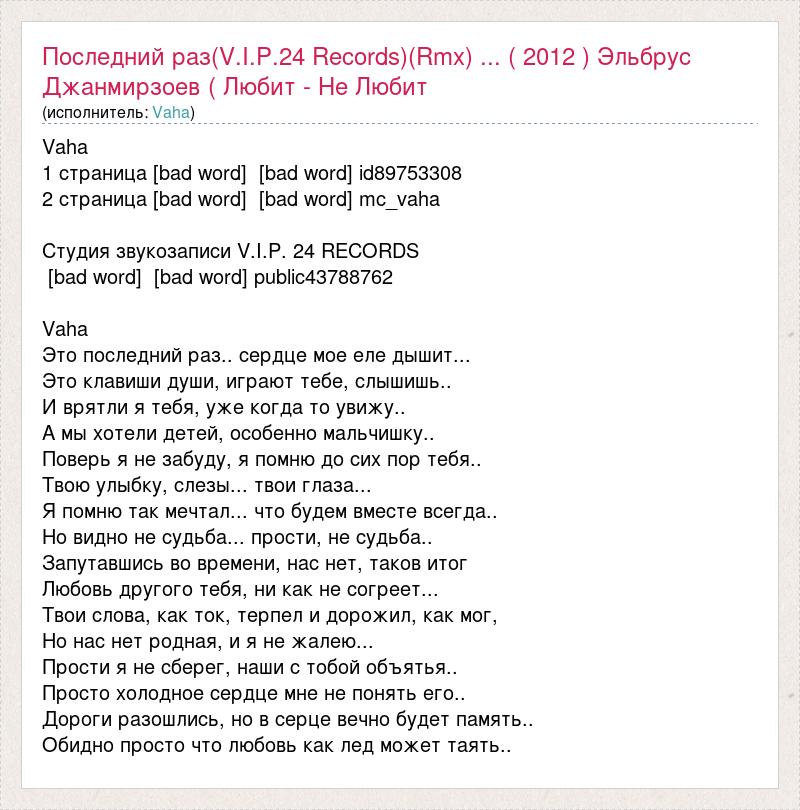 Vaha 1 страница [bad word] [bad word] id89753308 2 страница [bad word] [bad word] mc_vaha Студия звукозаписи V.I.P. 24 RECORDS [bad word] [bad word] public43788762 Vaha Это последний раз.. сердце мое еле дышит... Это клавиши души, играют тебе, слышишь.. И врятли я тебя, уже когда то увижу.. А мы хотели детей, особенно мальчишку.. Поверь я не забуду, я помню до сих пор тебя.. Твою улыбку, слезы... твои глаза... Я помню так мечтал... что будем вместе всегда.. Но видно не судьба... прости, не судьба.. Запутавшись во времени, нас нет, таков итог Любовь другого тебя, ни как не согреет... Твои слова, как ток, терпел и дорожил, как мог, Но нас нет родная, и я не жалею... Прости я не сберег, наши с тобой объятья.. Просто холодное сердце мне не понять его.. Дороги разошлись, но в серце вечно будет память.. Обидно просто что любовь как лед может таять..