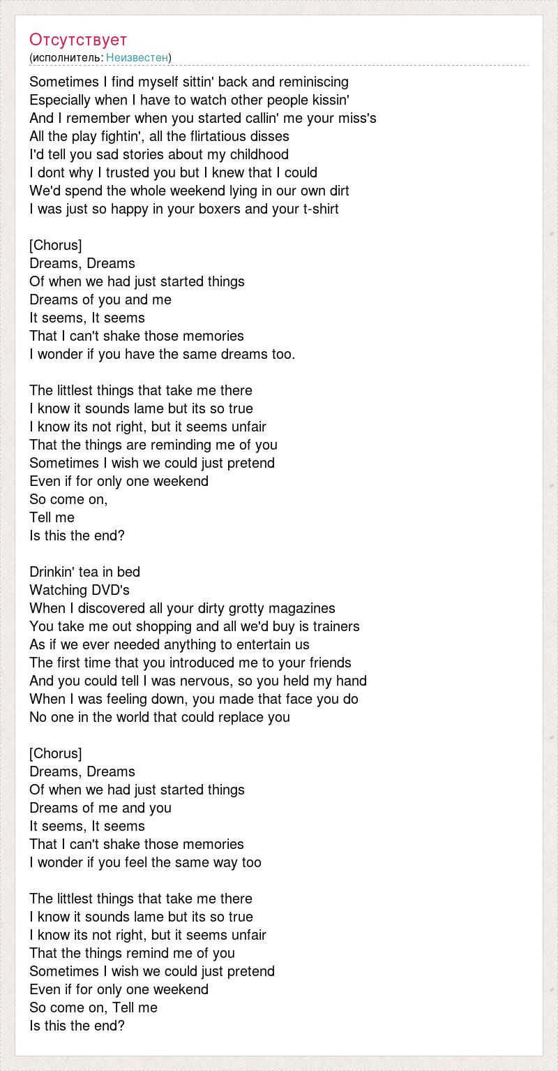 Sometimes I find myself sittin' back and reminiscing Especially when I have to watch other people kissin' And I remember when you started callin' me your miss's All the play fightin', all the flirtatious disses I'd tell you sad stories about my childhood I dont why I trusted you but I knew that I could We'd spend the whole weekend lying in our own dirt I was just so happy in your boxers and your t-shirt [Chorus] Dreams, Dreams Of when we had just started things Dreams of you and me It seems, It seems That I can't shake those memories I wonder if you have the same dreams too. The littlest things that take me there I know it sounds lame but its so true I know its not right, but it seems unfair That the things are reminding me of you Sometimes I wish we could just pretend Even if for only one weekend So come on, Tell me Is this the end? Drinkin' tea in bed Watching DVD's When I discovered all your dirty grotty magazines You take me out shopping and all we'd buy is trainers As if we ever needed anything to entertain us The first time that you introduced me to your friends And you could tell I was nervous, so you held my hand When I was feeling down, you made that face you do No one in the world that could replace you [Chorus] Dreams, Dreams Of when we had just started things Dreams of me and you It seems, It seems That I can't shake those memories I wonder if you feel the same way too The littlest things that take me there I know it sounds lame but its so true I know its not right, but it seems unfair That the things remind me of you Sometimes I wish we could just pretend Even if for only one weekend So come on, Tell me Is this the end?