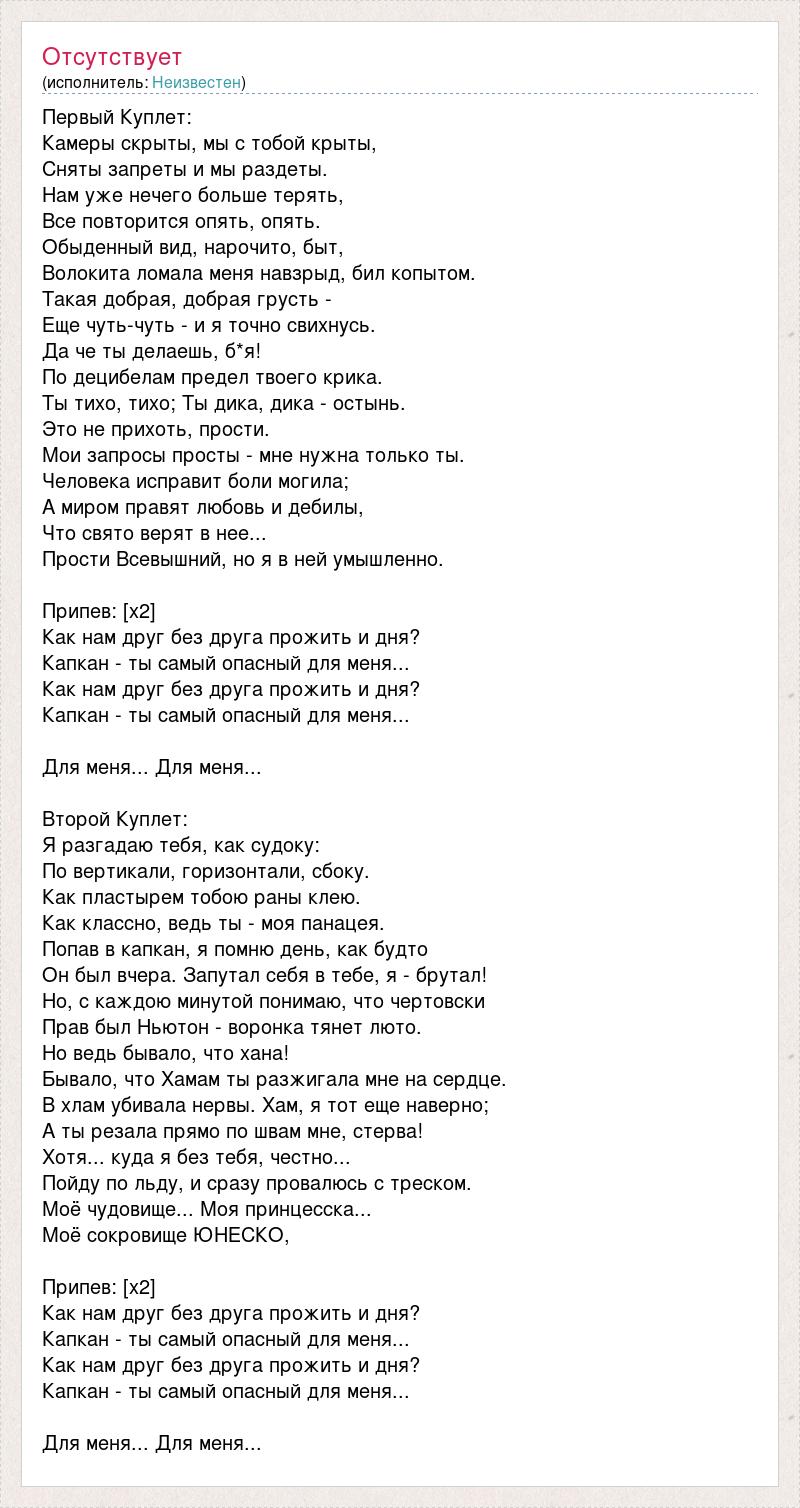 Первый Куплет: Камеры скрыты, мы с тобой крыты, Сняты запреты и мы раздеты. Нам уже нечего больше терять, Все повторится опять, опять. Обыденный вид, нарочито, быт, Волокита ломала меня навзрыд, бил копытом. Такая добрая, добрая грусть - Еще чуть-чуть - и я точно свихнусь. Да че ты делаешь, б*я! По децибелам предел твоего крика. Ты тихо, тихо; Ты дика, дика - остынь. Это не прихоть, прости. Мои запросы просты - мне нужна только ты. Человека исправит боли могила; А миром правят любовь и дебилы, Что свято верят в нее... Прости Всевышний, но я в ней умышленно. Припев: [х2] Как нам друг без друга прожить и дня? Капкан - ты самый опасный для меня... Как нам друг без друга прожить и дня? Капкан - ты самый опасный для меня... Для меня... Для меня... Второй Куплет: Я разгадаю тебя, как судоку: По вертикали, горизонтали, сбоку. Как пластырем тобою раны клею. Как классно, ведь ты - моя панацея. Попав в капкан, я помню день, как будто Он был вчера. Запутал себя в тебе, я - брутал! Но, с каждою минутой понимаю, что чертовски Прав был Ньютон - воронка тянет люто. Но ведь бывало, что хана! Бывало, что Хамам ты разжигала мне на сердце. В хлам убивала нервы. Хам, я тот еще наверно; А ты резала прямо по швам мне, стерва! Хотя... куда я без тебя, честно... Пойду по льду, и сразу провалюсь с треском. Моё чудовище... Моя принцесска... Моё сокровище ЮНЕСКО, Припев: [х2] Как нам друг без друга прожить и дня? Капкан - ты самый опасный для меня... Как нам друг без друга прожить и дня? Капкан - ты самый опасный для меня... Для меня... Для меня...