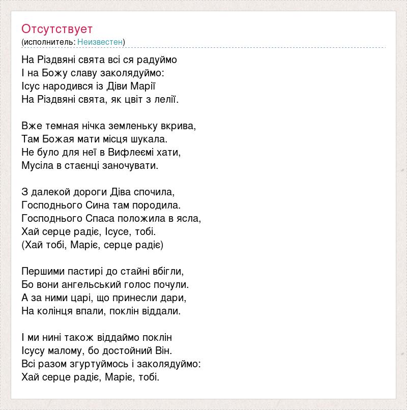 На Різдвяні свята всі ся радуймо І на Божу славу заколядуймо: Ісус народився із Діви Марії На Різдвяні свята, як цвіт з лелії. Вже темная нічка земленьку вкрива, Там Божая мати місця шукала. Не було для неї в Вифлеємі хати, Мусіла в стаєнці заночувати. З далекой дороги Діва спочила, Господнього Сина там породила. Господнього Спаса положила в ясла, Хай серце радіє, Ісусе, тобі. (Хай тобі, Маріє, серце радіє) Першими пастирі до стайні вбігли, Бо вони ангельський голос почули. А за ними царі, що принесли дари, На колінця впали, поклін віддали. І ми нині також віддаймо поклін Ісусу малому, бо достойний Він. Всі разом згуртуймось і заколядуймо: Хай серце радіє, Маріє, тобі.