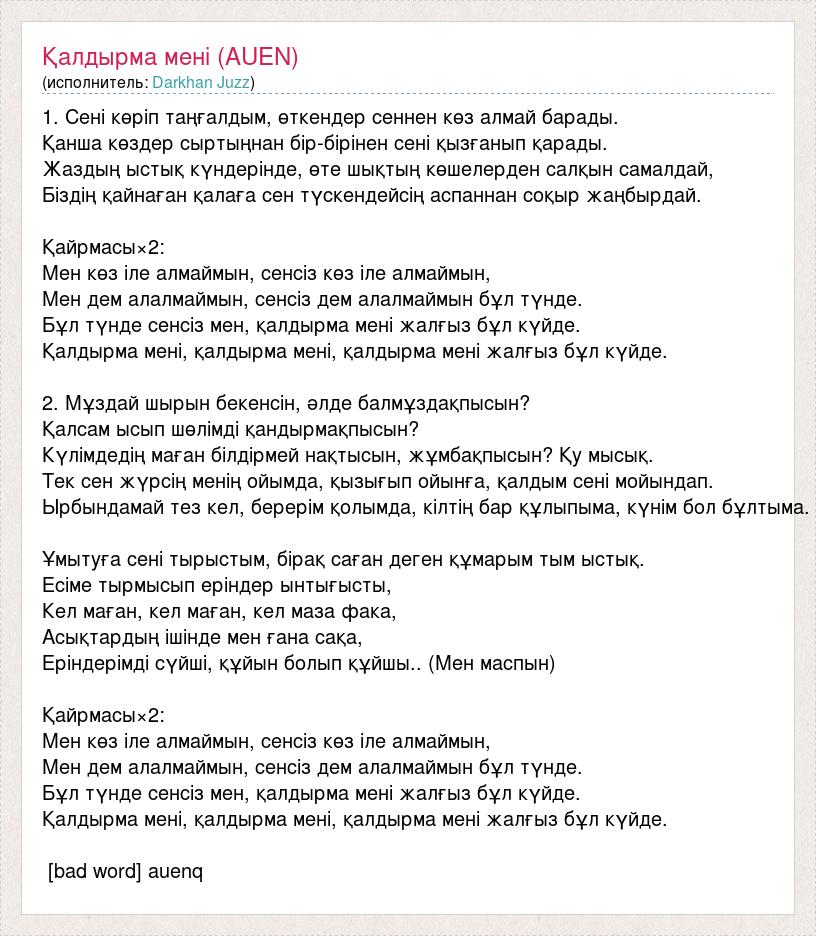 1. Сені көріп таңғалдым, өткендер сеннен көз алмай барады. Қанша көздер сыртыңнан бір-бірінен сені қызғанып қарады. Жаздың ыстық күндерінде, өте шықтың көшелерден салқын самалдай, Біздің қайнаған қалаға сен түскендейсің аспаннан соқыр жаңбырдай. Қайрмасы×2: Мен көз іле алмаймын, сенсіз көз іле алмаймын, Мен дем алалмаймын, сенсіз дем алалмаймын бұл түнде. Бұл түнде сенсіз мен, қалдырма мені жалғыз бұл күйде. Қалдырма мені, қалдырма мені, қалдырма мені жалғыз бұл күйде. 2. Мұздай шырын бекенсін, әлде балмұздақпысын? Қалсам ысып шөлімді қандырмақпысын? Күлімдедің маған білдірмей нақтысын, жұмбақпысын? Қу мысық. Тек сен жүрсің менің ойымда, қызығып ойынға, қалдым сені мойындап. Ырбындамай тез кел, берерім қолымда, кілтің бар құлыпыма, күнім бол бұлтыма. Ұмытуға сені тырыстым, бірақ саған деген құмарым тым ыстық. Есіме тырмысып еріндер ынтығысты, Кел маған, кел маған, кел маза фака, Асықтардың ішінде мен ғана сақа, Еріндерімді сүйші, құйын болып құйшы.. (Мен маспын) Қайрмасы×2: Мен көз іле алмаймын, сенсіз көз іле алмаймын, Мен дем алалмаймын, сенсіз дем алалмаймын бұл түнде. Бұл түнде сенсіз мен, қалдырма мені жалғыз бұл күйде. Қалдырма мені, қалдырма мені, қалдырма мені жалғыз бұл күйде. [bad word] auenq