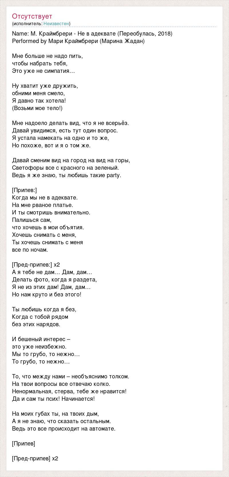 Name: М. Краймбрери - Не в адеквате (Переобулась, 2018) Performed by Мари Краймбрери (Марина Жадан) Мне больше не надо пить, чтобы набрать тебя, Это уже не симпатия… Ну хватит уже дружить, обними меня смело, Я давно так хотела! (Возьми мое тело!) Мне надоело делать вид, что я не всерьёз. Давай увидимся, есть тут один вопрос. Я устала намекать на одно и то же, Но похоже, вот и я о том же. Давай сменим вид на город на вид на горы, Светофоры все с красного на зеленый. Ведь я же знаю, ты любишь такие party. [Припев:] Когда мы не в адеквате. На мне рваное платье. И ты смотришь внимательно. Палишься сам, что хочешь в мои объятия. Хочешь снимать с меня, Ты хочешь снимать с меня все по ночам. [Пред-припев:] x2 А я тебе не дам… Дам, дам… Делать фото, когда я раздета, Я не из этих дам! Дам, дам… Но нам круто и без этого! Ты любишь когда я без, Когда с тобой рядом без этих нарядов. И бешеный интерес – это уже неизбежно. Мы то грубо, то нежно… То грубо, то нежно… То, что между нами – необъяснимо толком. На твои вопросы все отвечаю колко. Ненормальная, стерва, тебе же нравится! Да и сам ты псих! Начинается! На моих губах ты, на твоих дым, А я не знаю, что сказать остальным. Ведь это все происходит на автомате. [Припев] [Пред-припев] x2