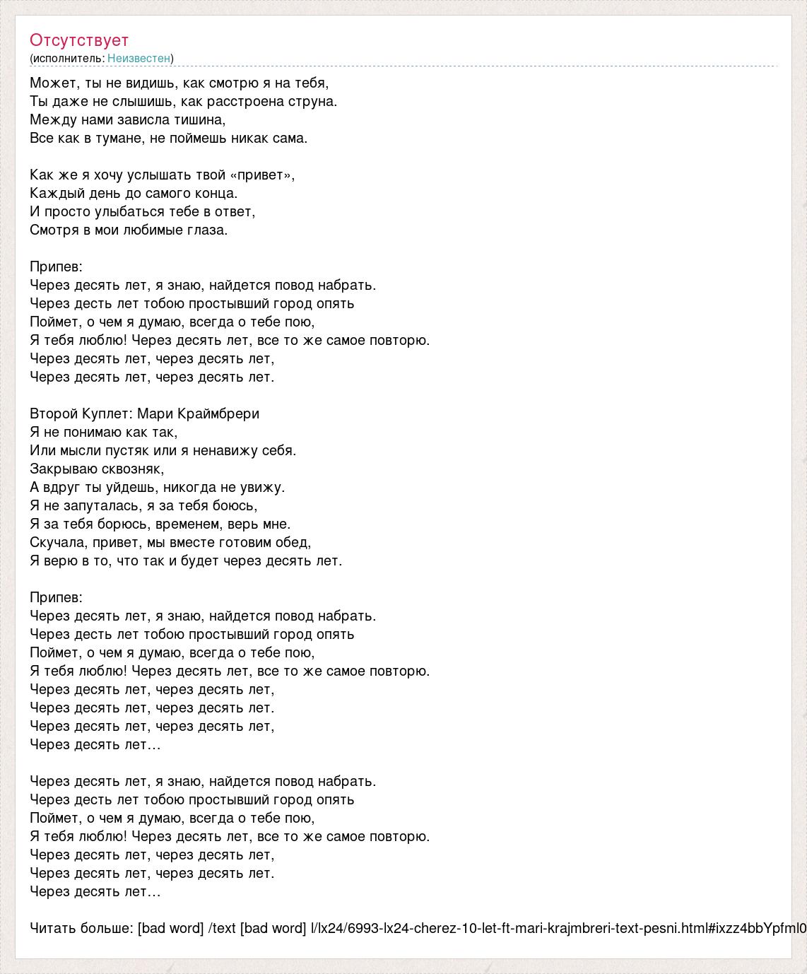 Может, ты не видишь, как смотрю я на тебя, Ты даже не слышишь, как расстроена струна. Между нами зависла тишина, Все как в тумане, не поймешь никак сама. Как же я хочу услышать твой «привет», Каждый день до самого конца. И просто улыбаться тебе в ответ, Смотря в мои любимые глаза. Припев: Через десять лет, я знаю, найдется повод набрать. Через десть лет тобою простывший город опять Поймет, о чем я думаю, всегда о тебе пою, Я тебя люблю! Через десять лет, все то же самое повторю. Через десять лет, через десять лет, Через десять лет, через десять лет. Второй Куплет: Мари Краймбрери Я не понимаю как так, Или мысли пустяк или я ненавижу себя. Закрываю сквозняк, А вдруг ты уйдешь, никогда не увижу. Я не запуталась, я за тебя боюсь, Я за тебя борюсь, временем, верь мне. Скучала, привет, мы вместе готовим обед, Я верю в то, что так и будет через десять лет. Припев: Через десять лет, я знаю, найдется повод набрать. Через десть лет тобою простывший город опять Поймет, о чем я думаю, всегда о тебе пою, Я тебя люблю! Через десять лет, все то же самое повторю. Через десять лет, через десять лет, Через десять лет, через десять лет. Через десять лет, через десять лет, Через десять лет… Через десять лет, я знаю, найдется повод набрать. Через десть лет тобою простывший город опять Поймет, о чем я думаю, всегда о тебе пою, Я тебя люблю! Через десять лет, все то же самое повторю. Через десять лет, через десять лет, Через десять лет, через десять лет. Через десять лет… Читать больше: [bad word] /text [bad word] l/lx24/6993-lx24-cherez-10-let-ft-mari-krajmbreri-text-pesni.html#ixzz4bbYpfml0