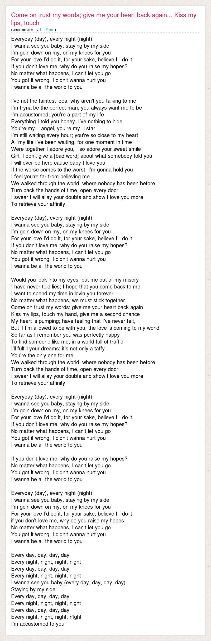Everyday (day), every night (night) I wanna see you baby, staying by my side I’m goin down on my, on my knees for you For your love I’d do it, for your sake, believe I’ll do it If you don’t love me, why do you raise my hopes? No matter what happens, I can't let you go You got it wrong, I didn’t wanna hurt you I wanna be all the world to you I’ve not the faintest idea, why aren’t you talking to me I’m tryna be the perfect man, you always want me to be I’m accustomed; you’re a part of my life Everything I told you honey, I’ve nothing to hide You’re my lil angel, you're my lil star I’m still waiting every hour; you're so close to my heart All my life I’ve been waiting, for one moment in time Were together I adore you, I so adore your sweet smile Girl, I don’t give a [bad word] about what somebody told you I will ever be here cause baby I love you If the worse comes to the worst, I’m gonna hold you I feel you're far from believing me We walked through the world, where nobody has been before Turn back the hands of time, open every door I swear I will allay your doubts and show I love you more To retrieve your affinity Everyday (day), every night (night) I wanna see you baby, staying by my side I’m goin down on my, on my knees for you For your love I’d do it, for your sake, believe I’ll do it If you don’t love me, why do you raise my hopes? No matter what happens, I can't let you go You got it wrong, I didn’t wanna hurt you I wanna be all the world to you Would you look into my eyes, put me out of my misery I have never told lies; I hope that you come back to me I want to spend my time in lovin you forever No matter what happens, we must stick together Come on trust my words; give me your heart back again Kiss my lips, touch my hand, give me a second chance My heart is pumping; have feeling that I’ve never felt, But if I’m allowed to be with you, the love is coming to my world So far as I remember you was perfectly happy To find someone like me, in a world full of traffic I’ll fulfill your dreams; it’s not only a taffy You’re the only one for me We walked through the world, where nobody has been before Turn back the hands of time, open every door I swear I will allay your doubts and show I love you more To retrieve your affinity Everyday (day), every night (night) I wanna see you baby, staying by my side I’m goin down on my, on my knees for you For your love I’d do it, for your sake, believe I’ll do it If you don’t love me, why do you raise my hopes? No matter what happens, I can't let you go You got it wrong, I didn’t wanna hurt you I wanna be all the world to you If you don’t love me, why do you raise my hopes? No matter what happens, I can't let you go You got it wrong, I didn’t wanna hurt you I wanna be all the world to you Everyday (day), every night (night) I wanna see you baby, staying by my side I’m goin down on my, on my knees for you For your love I’d do it, for your sake, believe I’ll do it if you don’t love me, why do you raise my hopes No matter what happens, I can't let you go You got it wrong, I didn’t wanna hurt you I wanna be all the world to you Every day, day, day, day Every night, night, night, night Every day, day, day, day Every night, night, night, night I wanna see you baby (every day, day, day, day) Staying by my side Every day, day, day, day Every night, night, night, night Every day, day, day, day Every night, night, night, nïght I’m accustomed to you