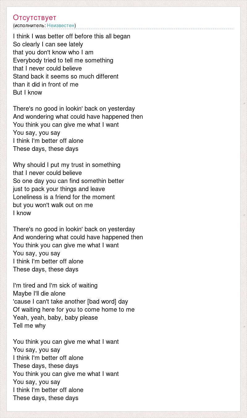I think I was better off before this all began So clearly I can see lately that you don't know who I am Everybody tried to tell me something that I never could believe Stand back it seems so much different than it did in front of me But I know There's no good in lookin' back on yesterday And wondering what could have happened then You think you can give me what I want You say, you say I think I'm better off alone These days, these days Why should I put my trust in something that I never could believe So one day you can find somethin better just to pack your things and leave Loneliness is a friend for the moment but you won't walk out on me I know There's no good in lookin' back on yesterday And wondering what could have happened then You think you can give me what I want You say, you say I think I'm better off alone These days, these days I'm tired and I'm sick of waiting Maybe I'll die alone 'cause I can't take another [bad word] day Of waiting here for you to come home to me Yeah, yeah, baby, baby please Tell me why You think you can give me what I want You say, you say I think I'm better off alone These days, these days You think you can give me what I want You say, you say I think I'm better off alone These days, these days