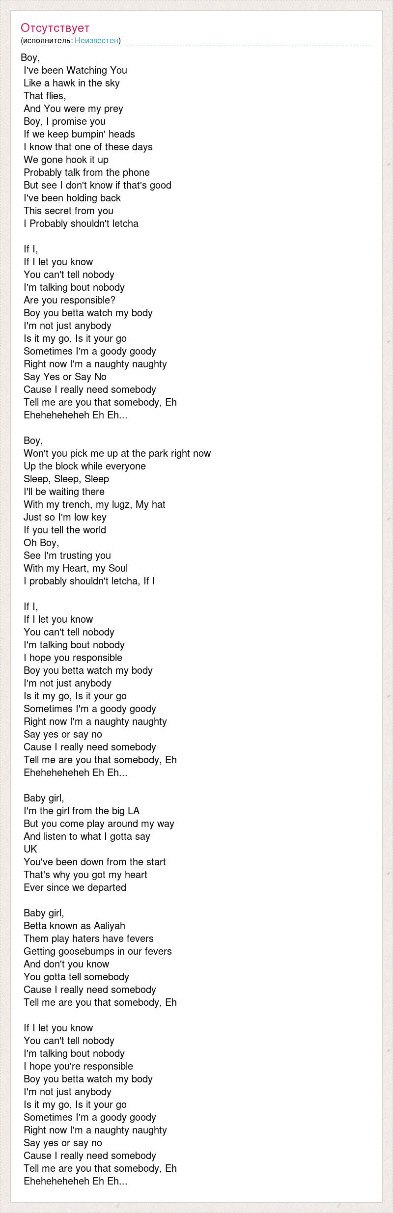 Boy, I've been Watching You Like a hawk in the sky That flies, And You were my prey Boy, I promise you If we keep bumpin' heads I know that one of these days We gone hook it up Probably talk from the phone But see I don't know if that's good I've been holding back This secret from you I Probably shouldn't letcha If I, If I let you know You can't tell nobody I'm talking bout nobody Are you responsible? Boy you betta watch my body I'm not just anybody Is it my go, Is it your go Sometimes I'm a goody goody Right now I'm a naughty naughty Say Yes or Say No Cause I really need somebody Tell me are you that somebody, Eh Eheheheheheh Eh Eh... Boy, Won't you pick me up at the park right now Up the block while everyone Sleep, Sleep, Sleep I'll be waiting there With my trench, my lugz, My hat Just so I'm low key If you tell the world Oh Boy, See I'm trusting you With my Heart, my Soul I probably shouldn't letcha, If I If I, If I let you know You can't tell nobody I'm talking bout nobody I hope you responsible Boy you betta watch my body I'm not just anybody Is it my go, Is it your go Sometimes I'm a goody goody Right now I'm a naughty naughty Say yes or say no Cause I really need somebody Tell me are you that somebody, Eh Eheheheheheh Eh Eh... Baby girl, I'm the girl from the big LA But you come play around my way And listen to what I gotta say UK You've been down from the start That's why you got my heart Ever since we departed Baby girl, Betta known as Aaliyah Them play haters have fevers Getting goosebumps in our fevers And don't you know You gotta tell somebody Cause I really need somebody Tell me are you that somebody, Eh If I let you know You can't tell nobody I'm talking bout nobody I hope you're responsible Boy you betta watch my body I'm not just anybody Is it my go, Is it your go Sometimes I'm a goody goody Right now I'm a naughty naughty Say yes or say no Cause I really need somebody Tell me are you that somebody, Eh Eheheheheheh Eh Eh...