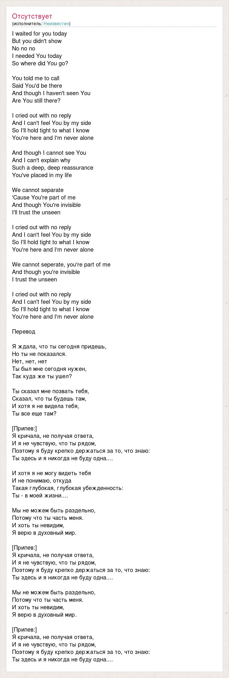 I waited for you today But you didn't show No no no I needed You today So where did You go? You told me to call Said You'd be there And though I haven't seen You Are You still there? I cried out with no reply And I can't feel You by my side So I'll hold tight to what I know You're here and I'm never alone And though I cannot see You And I can't explain why Such a deep, deep reassurance You've placed in my life We cannot separate 'Cause You're part of me And though You're invisible I'll trust the unseen I cried out with no reply And I can't feel You by my side So I'll hold tight to what I know You're here and I'm never alone We cannot seperate, you're part of me And though you're invisible I trust the unseen I cried out with no reply And I can't feel You by my side So I'll hold tight to what I know You're here and I'm never alone Перевод Я ждала, что ты сегодня придешь, Но ты не показался. Нет, нет, нет Ты был мне сегодня нужен, Так куда же ты ушел? Ты сказал мне позвать тебя, Сказал, что ты будешь там, И хотя я не видела тебя, Ты все еще там? [Припев:] Я кричала, не получая ответа, И я не чувствую, что ты рядом, Поэтому я буду крепко держаться за то, что знаю: Ты здесь и я никогда не буду одна.... И хотя я не могу видеть тебя И не понимаю, откуда Такая глубокая, глубокая убежденность: Ты - в моей жизни.... Мы не можем быть раздельно, Потому что ты часть меня. И хоть ты невидим, Я верю в духовный мир. [Припев:] Я кричала, не получая ответа, И я не чувствую, что ты рядом, Поэтому я буду крепко держаться за то, что знаю: Ты здесь и я никогда не буду одна.... Мы не можем быть раздельно, Потому что ты часть меня. И хоть ты невидим, Я верю в духовный мир. [Припев:] Я кричала, не получая ответа, И я не чувствую, что ты рядом, Поэтому я буду крепко держаться за то, что знаю: Ты здесь и я никогда не буду одна....