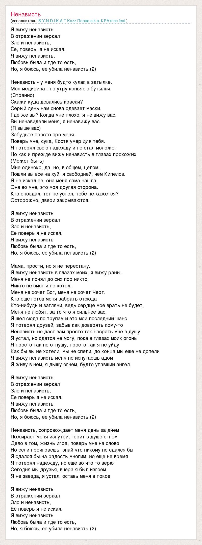 Я вижу ненависть В отражении зеркал Зло и ненависть, Ее, поверь, я не искал. Я вижу ненависть, Любовь была и где то есть, Но, я боюсь, ее убила ненависть.(2) Ненависть - у меня будто кулак в затылке. Моя медицина - по утру коньяк с бутылки. (Странно) Скажи куда девались краски? Серый день нам снова одевает маски. Где же вы? Когда мне плохо, я не вижу вас. Вы ненавидели меня, я ненавижу вас. (Я выше вас) Забудьте просто про меня. Поверь мне, сука, Костя умер для тебя. Я потерял свою надежду и не стал моложе. Но как и прежде вижу ненависть в глазах прохожих. (Может быть) Мне одиноко, да, но, в общем, целом. Пошли вы все на хуй, я свободней, чем Кипелов. Я не искал ее, она меня сама нашла. Она во мне, это моя другая сторона. Кто опоздал, тот не успел, тебе не кажется? Осторожно, двери закрываются. Я вижу ненависть В отражении зеркал Зло и ненависть, Ее поверь я не искал. Я вижу ненависть Любовь была и где то есть, Но, я боюсь, ее убила ненависть.(2) Мама, прости, но я не перестану. Я вижу ненависть в глазах моих, я вижу раны. Меня не понял до сих пор никто, Никто не смог и не хотел, Меня не хочет Бог, меня не хочет Черт. Кто еще готов меня забрать отсюда Кто-нибудь и загляни, ведь сердце мое врать не будет, Меня не любят, за то что я сильнее вас. Я шел сюда по трупам и это мой последний шанс Я потерял друзей, забыв как доверять кому-то Ненависть не даст вам просто так насрать мне в душу Я устал, но сдатся не могу, пока в глазах моих огонь Я просто так не отпущу, просто так я не уйду Как бы вы не хотели, мы не спели, до конца мы еще не допели Я вижу ненависть меня не испугаешь адом Я живу в нем, я дышу огнем, будто упавший ангел. Я вижу ненависть В отражении зеркал Зло и ненависть, Ее поверь я не искал. Я вижу ненависть Любовь была и где то есть, Но, я боюсь, ее убила ненависть.(2) Ненависть, сопровождает меня день за днем Пожирает меня изнутри, горит в душе огнем Дело в том, жизнь игра, поверь мне на слово Но если проиграешь, знай что никому не сдался бы Я сдался бы на радость многим, но еще не время Я потерял надежду, но еще во что то верю Сегодня мы друзья, вчера я был изгоем Я не звезда, я устал, оставь меня в покое Я вижу ненависть В отражении зеркал Зло и ненависть, Ее поверь я не искал. Я вижу ненависть Любовь была и где то есть, Но, я боюсь, ее убила ненависть.(2)