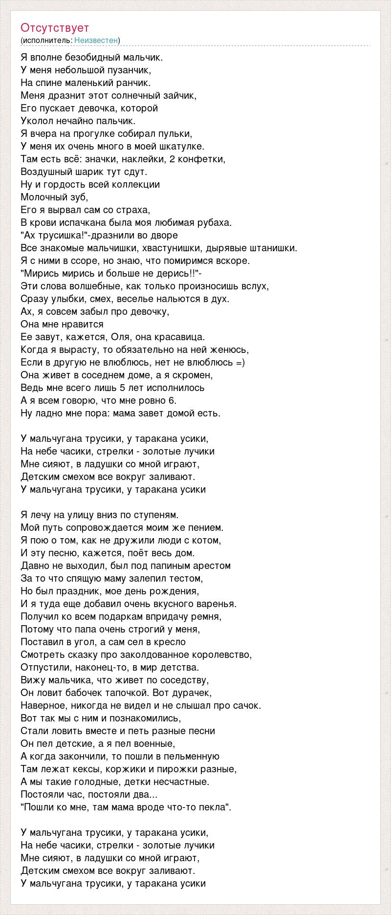 Я вполне безобидный мальчик. У меня небольшой пузанчик, На спине маленький ранчик. Меня дразнит этот солнечный зайчик, Его пускает девочка, которой Уколол нечайно пальчик. Я вчера на прогулке собирал пульки, У меня их очень много в моей шкатулке. Там есть всё: значки, наклейки, 2 конфетки, Воздушный шарик тут сдут. Ну и гордость всей коллекции Молочный зуб, Его я вырвал сам со страха, В крови испачкана была моя любимая рубаха. "Ах трусишка!"-дразнили во дворе Все знакомые мальчишки, хвастунишки, дырявые штанишки. Я с ними в ссоре, но знаю, что помиримся вскоре. "Мирись мирись и больше не дерись!!"- Эти слова волшебные, как только произносишь вслух, Сразу улыбки, смех, веселье нальются в дух. Ах, я совсем забыл про девочку, Она мне нравится Ее завут, кажется, Оля, она красавица. Когда я вырасту, то обязательно на ней женюсь, Если в другую не влюблюсь, нет не влюблюсь =) Она живет в соседнем доме, а я скромен, Ведь мне всего лишь 5 лет исполнилось А я всем говорю, что мне ровно 6. Ну ладно мне пора: мама завет домой есть. У мальчугана трусики, у таракана усики, На небе часики, стрелки - золотые лучики Мне сияют, в ладушки со мной играют, Детским смехом все вокруг заливают. У мальчугана трусики, у таракана усики Я лечу на улицу вниз по ступеням. Мой путь сопровождается моим же пением. Я пою о том, как не дружили люди с котом, И эту песню, кажется, поёт весь дом. Давно не выходил, был под папиным арестом За то что спящую маму залепил тестом, Но был праздник, мое день рождения, И я туда еще добавил очень вкусного варенья. Получил ко всем подаркам впридачу ремня, Потому что папа очень строгий у меня, Поставил в угол, а сам сел в кресло Смотреть сказку про заколдованное королевство, Отпустили, наконец-то, в мир детства. Вижу мальчика, что живет по соседству, Он ловит бабочек тапочкой. Вот дурачек, Наверное, никогда не видел и не слышал про сачок. Вот так мы с ним и познакомились, Стали ловить вместе и петь разные песни Он пел детские, а я пел военные, А когда закончили, то пошли в пельменную Там лежат кексы, коржики и пирожки разные, А мы такие голодные, детки несчастные. Постояли час, постояли два... "Пошли ко мне, там мама вроде что-то пекла". У мальчугана трусики, у таракана усики, На небе часики, стрелки - золотые лучики Мне сияют, в ладушки со мной играют, Детским смехом все вокруг заливают. У мальчугана трусики, у таракана усики