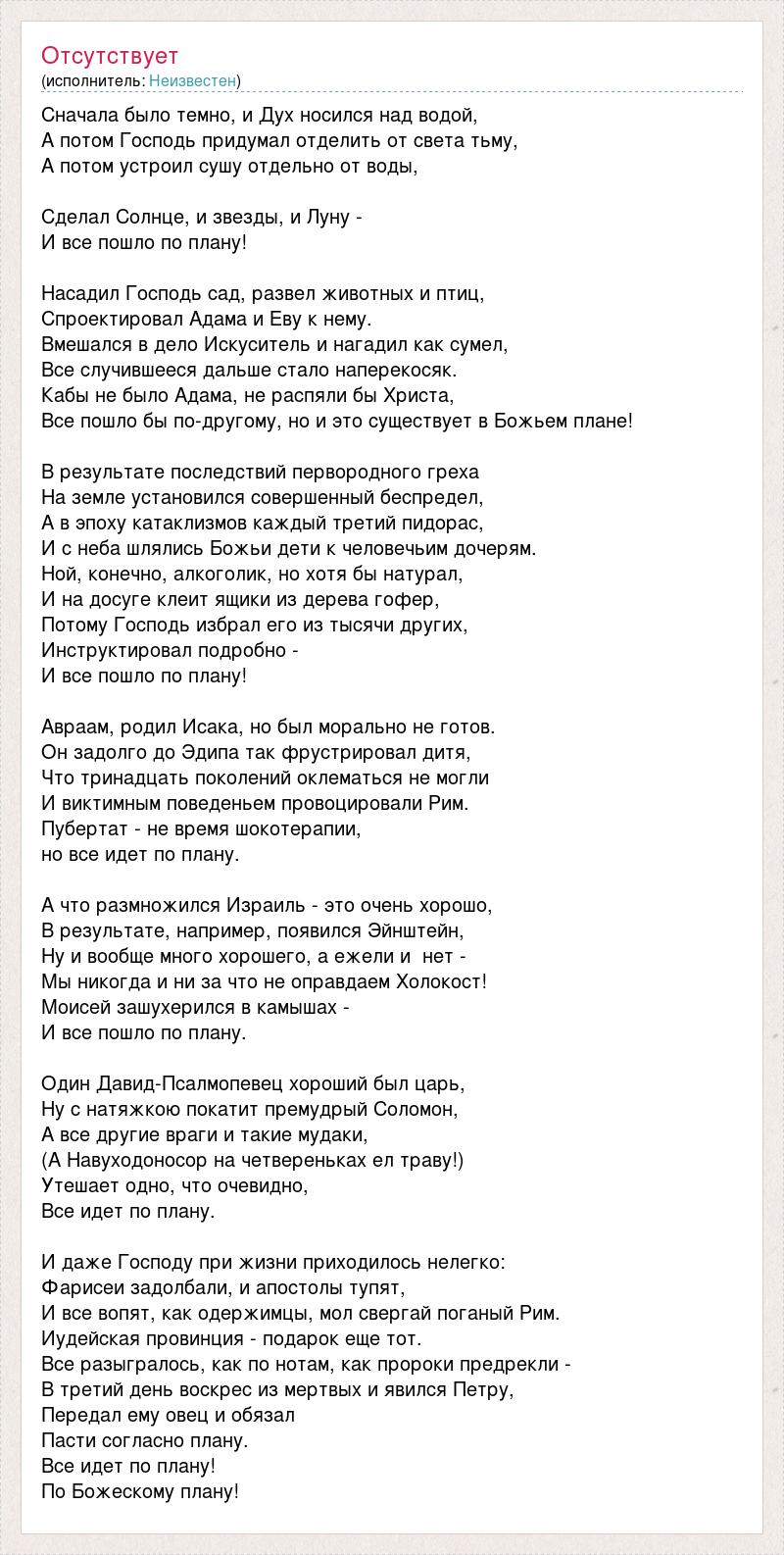 Сначала было темно, и Дух носился над водой, А потом Господь придумал отделить от света тьму, А потом устроил сушу отдельно от воды, Сделал Солнце, и звезды, и Луну - И все пошло по плану! Насадил Господь сад, развел животных и птиц, Спроектировал Адама и Еву к нему. Вмешался в дело Искуситель и нагадил как сумел, Все случившееся дальше стало наперекосяк. Кабы не было Адама, не распяли бы Христа, Все пошло бы по-другому, но и это существует в Божьем плане! В результате последствий первородного греха На земле установился совершенный беспредел, А в эпоху катаклизмов каждый третий пидорас, И с неба шлялись Божьи дети к человечьим дочерям. Ной, конечно, алкоголик, но хотя бы натурал, И на досуге клеит ящики из дерева гофер, Потому Господь избрал его из тысячи других, Инструктировал подробно - И все пошло по плану! Авраам, родил Исака, но был морально не готов. Он задолго до Эдипа так фрустрировал дитя, Что тринадцать поколений оклематься не могли И виктимным поведеньем провоцировали Рим. Пубертат - не время шокотерапии, но все идет по плану. А что размножился Израиль - это очень хорошо, В результате, например, появился Эйнштейн, Ну и вообще много хорошего, а ежели и нет - Мы никогда и ни за что не оправдаем Холокост! Моисей зашухерился в камышах - И все пошло по плану. Один Давид-Псалмопевец хороший был царь, Ну с натяжкою покатит премудрый Соломон, А все другие враги и такие мудаки, (А Навуходоносор на четвереньках ел траву!) Утешает одно, что очевидно, Все идет по плану. И даже Господу при жизни приходилось нелегко: Фарисеи задолбали, и апостолы тупят, И все вопят, как одержимцы, мол свергай поганый Рим. Иудейская провинция - подарок еще тот. Все разыгралось, как по нотам, как пророки предрекли - В третий день воскрес из мертвых и явился Петру, Передал ему овец и обязал Пасти согласно плану. Все идет по плану! По Божескому плану!