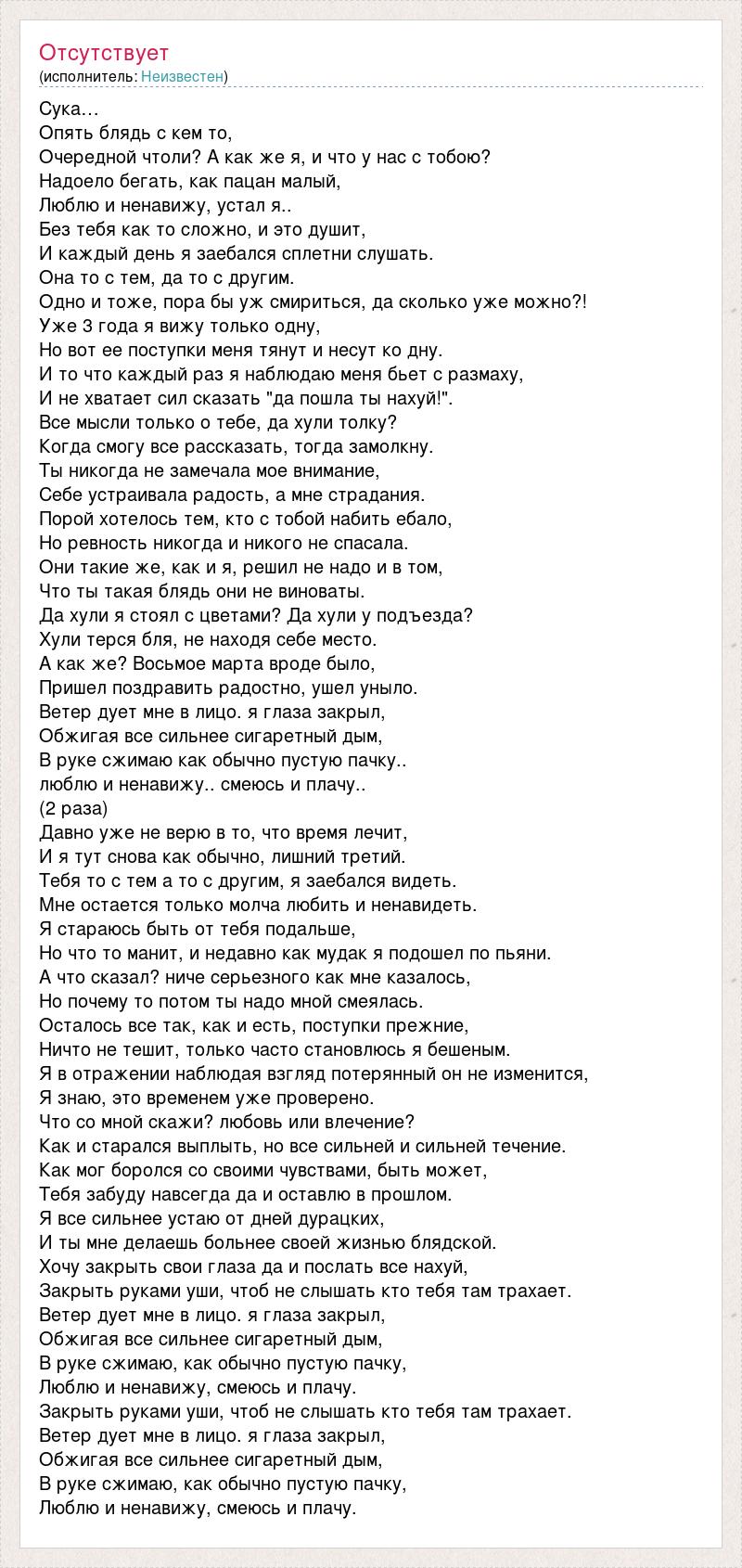 Сука… Опять блядь с кем то, Очередной чтоли? А как же я, и что у нас с тобою? Надоело бегать, как пацан малый, Люблю и ненавижу, устал я.. Без тебя как то сложно, и это душит, И каждый день я заебался сплетни слушать. Она то с тем, да то с другим. Одно и тоже, пора бы уж смириться, да сколько уже можно?! Уже 3 года я вижу только одну, Но вот ее поступки меня тянут и несут ко дну. И то что каждый раз я наблюдаю меня бьет с размаху, И не хватает сил сказать "да пошла ты нахуй!". Все мысли только о тебе, да хули толку? Когда смогу все рассказать, тогда замолкну. Ты никогда не замечала мое внимание, Себе устраивала радость, а мне страдания. Порой хотелось тем, кто с тобой набить ебало, Но ревность никогда и никого не спасала. Они такие же, как и я, решил не надо и в том, Что ты такая блядь они не виноваты. Да хули я стоял с цветами? Да хули у подъезда? Хули терся бля, не находя себе место. А как же? Восьмое марта вроде было, Пришел поздравить радостно, ушел уныло. Ветер дует мне в лицо. я глаза закрыл, Обжигая все сильнее сигаретный дым, В руке сжимаю как обычно пустую пачку.. люблю и ненавижу.. смеюсь и плачу.. (2 раза) Давно уже не верю в то, что время лечит, И я тут снова как обычно, лишний третий. Тебя то с тем а то с другим, я заебался видеть. Мне остается только молча любить и ненавидеть. Я стараюсь быть от тебя подальше, Но что то манит, и недавно как мудак я подошел по пьяни. А что сказал? ниче серьезного как мне казалось, Но почему то потом ты надо мной смеялась. Осталось все так, как и есть, поступки прежние, Ничто не тешит, только часто становлюсь я бешеным. Я в отражении наблюдая взгляд потерянный он не изменится, Я знаю, это временем уже проверено. Что со мной скажи? любовь или влечение? Как и старался выплыть, но все сильней и сильней течение. Как мог боролся со своими чувствами, быть может, Тебя забуду навсегда да и оставлю в прошлом. Я все сильнее устаю от дней дурацких, И ты мне делаешь больнее своей жизнью блядской. Хочу закрыть свои глаза да и послать все нахуй, Закрыть руками уши, чтоб не слышать кто тебя там трахает. Ветер дует мне в лицо. я глаза закрыл, Обжигая все сильнее сигаретный дым, В руке сжимаю, как обычно пустую пачку, Люблю и ненавижу, смеюсь и плачу. Закрыть руками уши, чтоб не слышать кто тебя там трахает. Ветер дует мне в лицо. я глаза закрыл, Обжигая все сильнее сигаретный дым, В руке сжимаю, как обычно пустую пачку, Люблю и ненавижу, смеюсь и плачу.