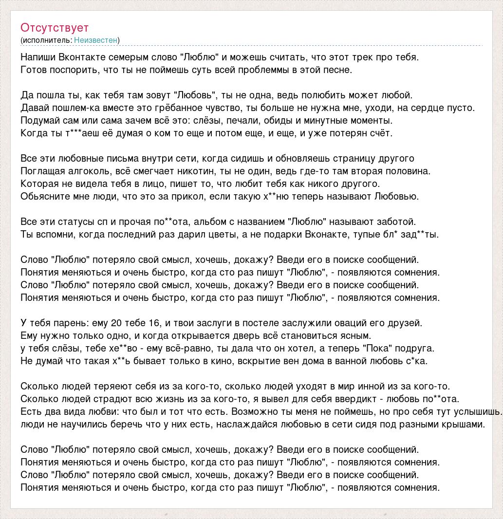 Напиши Вконтакте семерым слово "Люблю" и можешь считать, что этот трек про тебя. Готов поспорить, что ты не поймешь суть всей проблеммы в этой песне. Да пошла ты, как тебя там зовут "Любовь", ты не одна, ведь полюбить может любой. Давай пошлем-ка вместе это грёбанное чувство, ты больше не нужна мне, уходи, на сердце пусто. Подумай сам или сама зачем всё это: слёзы, печали, обиды и минутные моменты. Когда ты т***аеш её думая о ком то еще и потом еще, и еще, и уже потерян счёт. Все эти любовные письма внутри сети, когда сидишь и обновляешь страницу другого Поглащая алгоколь, всё смегчает никотин, ты не один, ведь где-то там вторая половина. Которая не видела тебя в лицо, пишет то, что любит тебя как никого другого. Обьясните мне люди, что это за прикол, если такую х**ню теперь называют Любовью. Все эти статусы сп и прочая по**ота, альбом с названием "Люблю" называют заботой. Ты вспомни, когда последний раз дарил цветы, а не подарки Вконакте, тупые бл* зад**ты. Слово "Люблю" потеряло свой смысл, хочешь, докажу? Введи его в поиске сообщений. Понятия меняються и очень быстро, когда сто раз пишут "Люблю", - появляются сомнения. Слово "Люблю" потеряло свой смысл, хочешь, докажу? Введи его в поиске сообщений. Понятия меняються и очень быстро, когда сто раз пишут "Люблю", - появляются сомнения. У тебя парень: ему 20 тебе 16, и твои заслуги в постеле заслужили оваций его друзей. Ему нужно только одно, и когда открывается дверь всё становиться ясным. у тебя слёзы, тебе хе**во - ему всё-равно, ты дала что он хотел, а теперь "Пока" подруга. Не думай что такая х**ь бывает только в кино, вскрытие вен дома в ванной любовь с*ка. Сколько людей теряеют себя из за кого-то, сколько людей уходят в мир инной из за кого-то. Сколько людей страдют всю жизнь из за кого-то, я вывел для себя ввердикт - любовь по**ота. Есть два вида любви: что был и тот что есть. Возможно ты меня не поймешь, но про себя тут услышишь. люди не научились беречь что у них есть, наслаждайся любовью в сети сидя под разными крышами. Слово "Люблю" потеряло свой смысл, хочешь, докажу? Введи его в поиске сообщений. Понятия меняються и очень быстро, когда сто раз пишут "Люблю", - появляются сомнения. Слово "Люблю" потеряло свой смысл, хочешь, докажу? Введи его в поиске сообщений. Понятия меняються и очень быстро, когда сто раз пишут "Люблю", - появляются сомнения.