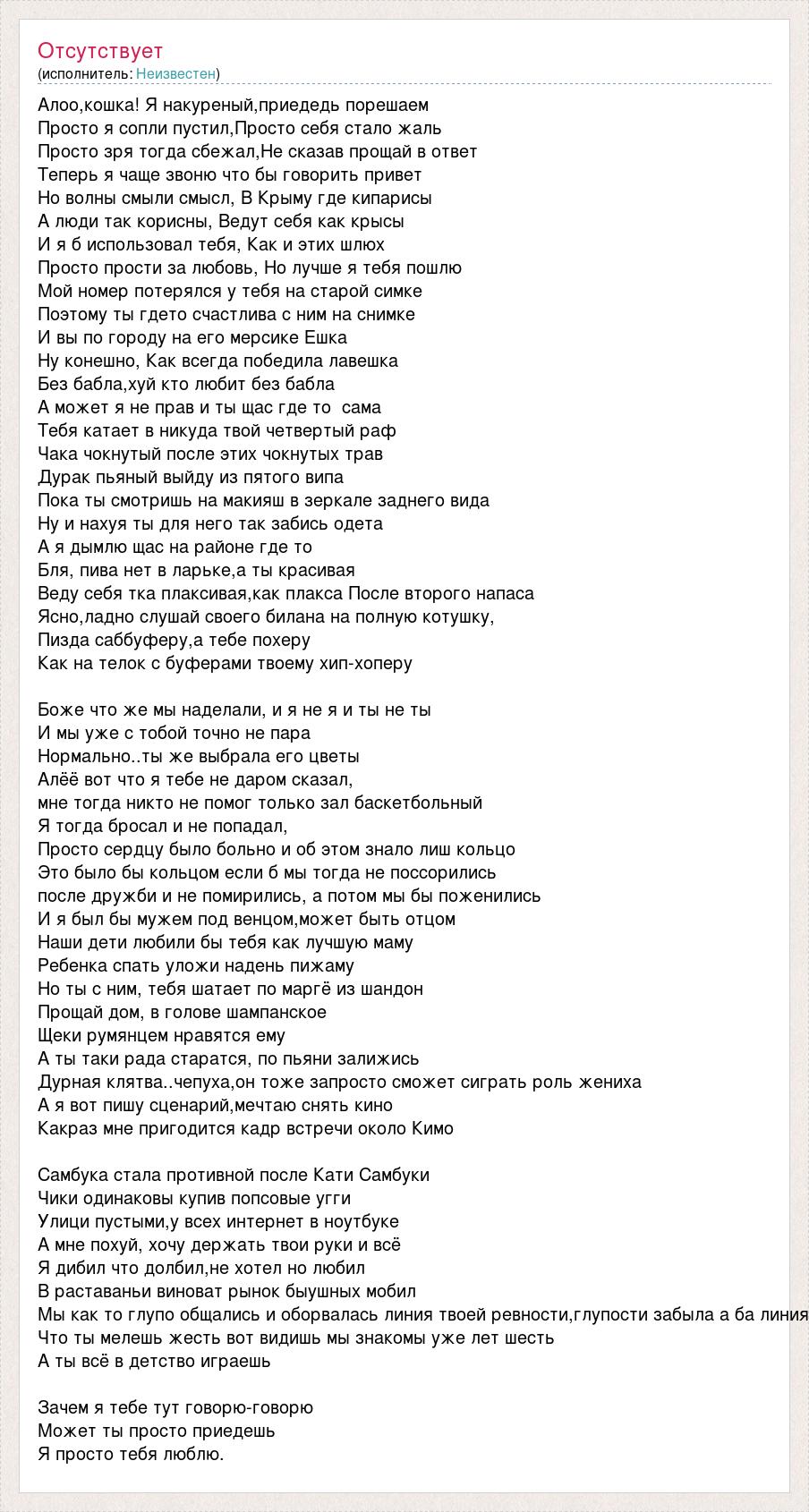Алоо,кошка! Я накуреный,приедедь порешаем Просто я сопли пустил,Просто себя стало жаль Просто зря тогда сбежал,Не сказав прощай в ответ Теперь я чаще звоню что бы говорить привет Но волны смыли смысл, В Крыму где кипарисы А люди так корисны, Ведут себя как крысы И я б использовал тебя, Как и этих шлюх Просто прости за любовь, Но лучше я тебя пошлю Мой номер потерялся у тебя на старой симке Поэтому ты гдето счастлива с ним на снимке И вы по городу на его мерсике Ешка Ну конешно, Как всегда победила лавешка Без бабла,хуй кто любит без бабла А может я не прав и ты щас где то сама Тебя катает в никуда твой четвертый раф Чака чокнутый после этих чокнутых трав Дурак пьяный выйду из пятого випа Пока ты смотришь на макияш в зеркале заднего вида Ну и нахуя ты для него так забись одета А я дымлю щас на районе где то Бля, пива нет в ларьке,а ты красивая Веду себя тка плаксивая,как плакса После второго напаса Ясно,ладно слушай своего билана на полную котушку, Пизда саббуферу,а тебе похеру Как на телок с буферами твоему хип-хоперу Боже что же мы наделали, и я не я и ты не ты И мы уже с тобой точно не пара Нормально..ты же выбрала его цветы Алёё вот что я тебе не даром сказал, мне тогда никто не помог только зал баскетбольный Я тогда бросал и не попадал, Просто сердцу было больно и об этом знало лиш кольцо Это было бы кольцом если б мы тогда не поссорились после дружби и не помирились, а потом мы бы поженились И я был бы мужем под венцом,может быть отцом Наши дети любили бы тебя как лучшую маму Ребенка спать уложи надень пижаму Но ты с ним, тебя шатает по маргё из шандон Прощай дом, в голове шампанское Щеки румянцем нравятся ему А ты таки рада старатся, по пьяни залижись Дурная клятва..чепуха,он тоже запросто сможет сиграть роль жениха А я вот пишу сценарий,мечтаю снять кино Какраз мне пригодится кадр встречи около Кимо Самбука стала противной после Кати Самбуки Чики одинаковы купив попсовые угги Улици пустыми,у всех интернет в ноутбуке А мне похуй, хочу держать твои руки и всё Я дибил что долбил,не хотел но любил В раставаньи виноват рынок быушных мобил Мы как то глупо общались и оборвалась линия твоей ревности,глупости забыла а ба линия Что ты мелешь жесть вот видишь мы знакомы уже лет шесть А ты всё в детство играешь Зачем я тебе тут говорю-говорю Может ты просто приедешь Я просто тебя люблю.