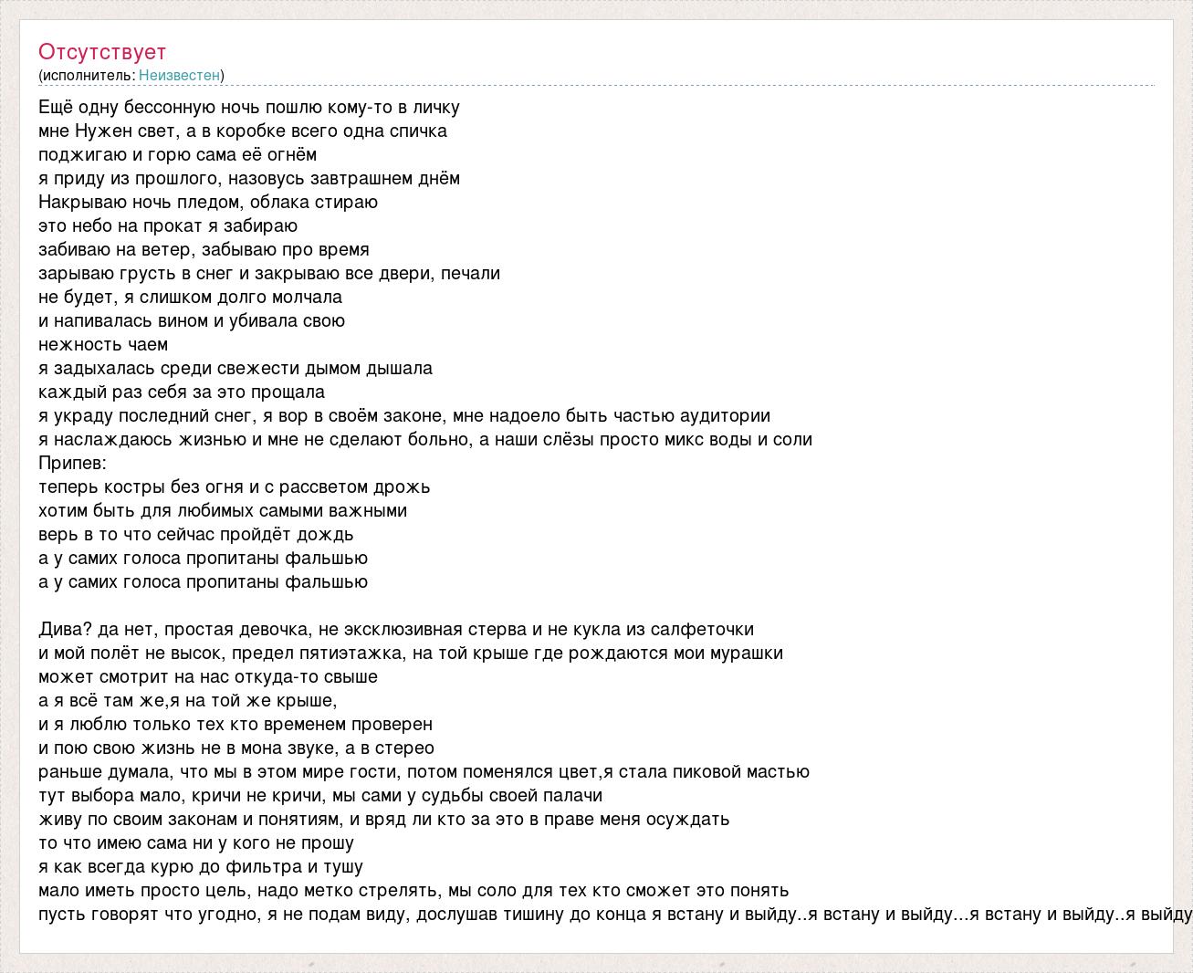 Ещё одну бессонную ночь пошлю кому-то в личку мне Нужен свет, а в коробке всего одна спичка поджигаю и горю сама её огнём я приду из прошлого, назовусь завтрашнем днём Накрываю ночь пледом, облака стираю это небо на прокат я забираю забиваю на ветер, забываю про время зарываю грусть в снег и закрываю все двери, печали не будет, я слишком долго молчала и напивалась вином и убивала свою нежность чаем я задыхалась среди свежести дымом дышала каждый раз себя за это прощала я украду последний снег, я вор в своём законе, мне надоело быть частью аудитории я наслаждаюсь жизнью и мне не сделают больно, а наши слёзы просто микс воды и соли Припев: теперь костры без огня и с рассветом дрожь хотим быть для любимых самыми важными верь в то что сейчас пройдёт дождь а у самих голоса пропитаны фальшью а у самих голоса пропитаны фальшью Дива? да нет, простая девочка, не эксклюзивная стерва и не кукла из салфеточки и мой полёт не высок, предел пятиэтажка, на той крыше где рождаются мои мурашки может смотрит на нас откуда-то свыше а я всё там же,я на той же крыше, и я люблю только тех кто временем проверен и пою свою жизнь не в мона звуке, а в стерео раньше думала, что мы в этом мире гости, потом поменялся цвет,я стала пиковой мастью тут выбора мало, кричи не кричи, мы сами у судьбы своей палачи живу по своим законам и понятиям, и вряд ли кто за это в праве меня осуждать то что имею сама ни у кого не прошу я как всегда курю до фильтра и тушу мало иметь просто цель, надо метко стрелять, мы соло для тех кто сможет это понять пусть говорят что угодно, я не подам виду, дослушав тишину до конца я встану и выйду..я встану и выйду...я встану и выйду..я выйду