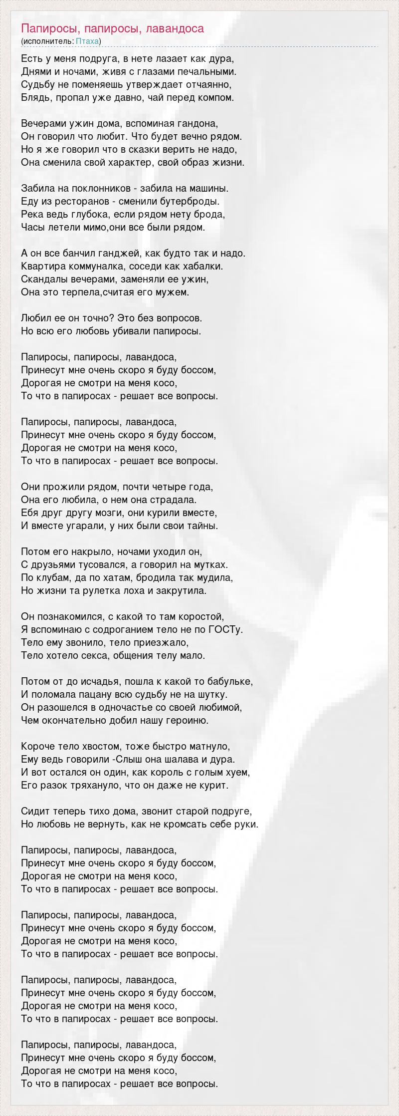 Есть у меня подруга, в нете лазает как дура, Днями и ночами, живя с глазами печальными. Судьбу не поменяешь утверждает отчаянно, Блядь, пропал уже давно, чай перед компом. Вечерами ужин дома, вспоминая гандона, Он говорил что любит. Что будет вечно рядом. Но я же говорил что в сказки верить не надо, Она сменила свой характер, свой образ жизни. Забила на поклонников - забила на машины. Еду из ресторанов - сменили бутерброды. Река ведь глубока, если рядом нету брода, Часы летели мимо,они все были рядом. А он все банчил ганджей, как будто так и надо. Квартира коммуналка, соседи как хабалки. Скандалы вечерами, заменяли ее ужин, Она это терпела,считая его мужем. Любил ее он точно? Это без вопросов. Но всю его любовь убивали папиросы. Папиросы, папиросы, лавандоса, Принесут мне очень скоро я буду боссом, Дорогая не смотри на меня косо, То что в папиросах - решает все вопросы. Папиросы, папиросы, лавандоса, Принесут мне очень скоро я буду боссом, Дорогая не смотри на меня косо, То что в папиросах - решает все вопросы. Они прожили рядом, почти четыре года, Она его любила, о нем она страдала. Ебя друг другу мозги, они курили вместе, И вместе угарали, у них были свои тайны. Потом его накрыло, ночами уходил он, С друзьями тусовался, а говорил на мутках. По клубам, да по хатам, бродила так мудила, Но жизни та рулетка лоха и закрутила. Он познакомился, с какой то там коростой, Я вспоминаю с содроганием тело не по ГОСТу. Тело ему звонило, тело приезжало, Тело хотело секса, общения телу мало. Потом от до исчадья, пошла к какой то бабульке, И поломала пацану всю судьбу не на шутку. Он разошелся в одночастье со своей любимой, Чем окончательно добил нашу героиню. Короче тело хвостом, тоже быстро матнуло, Ему ведь говорили -Слыш она шалава и дура. И вот остался он один, как король с голым хуем, Его разок тряхануло, что он даже не курит. Сидит теперь тихо дома, звонит старой подруге, Но любовь не вернуть, как не кромсать себе руки. Папиросы, папиросы, лавандоса, Принесут мне очень скоро я буду боссом, Дорогая не смотри на меня косо, То что в папиросах - решает все вопросы. Папиросы, папиросы, лавандоса, Принесут мне очень скоро я буду боссом, Дорогая не смотри на меня косо, То что в папиросах - решает все вопросы. Папиросы, папиросы, лавандоса, Принесут мне очень скоро я буду боссом, Дорогая не смотри на меня косо, То что в папиросах - решает все вопросы. Папиросы, папиросы, лавандоса, Принесут мне очень скоро я буду боссом, Дорогая не смотри на меня косо, То что в папиросах - решает все вопросы.