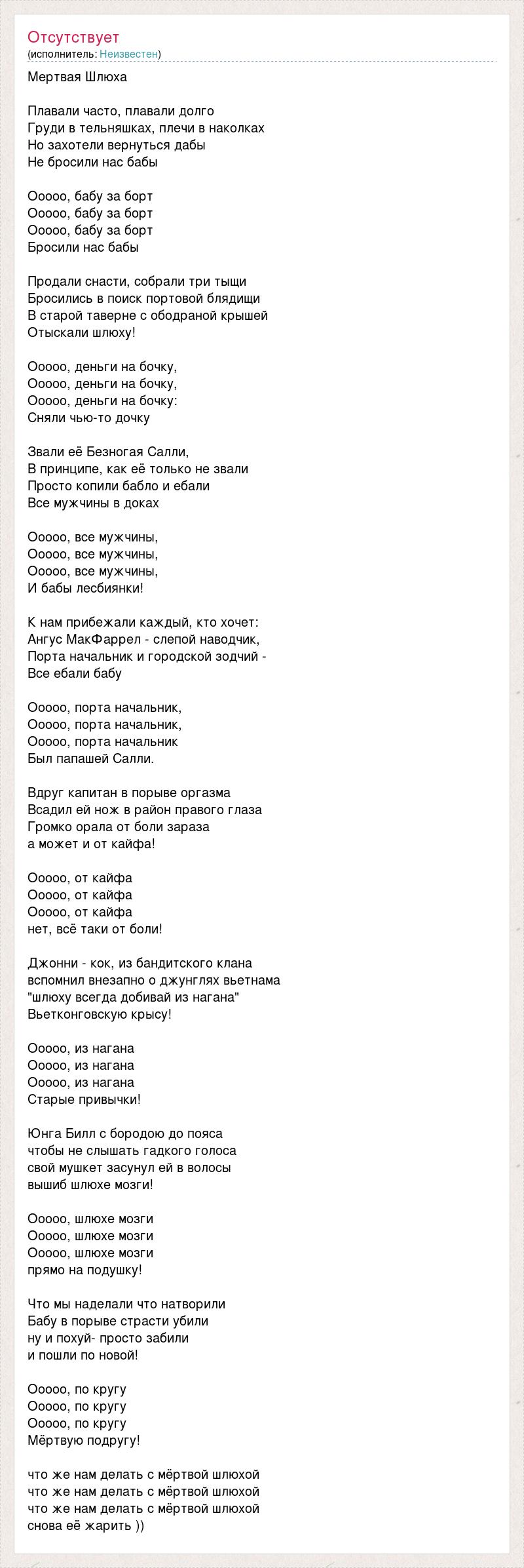Мертвая Шлюха Плавали часто, плавали долго Груди в тельняшках, плечи в наколках Но захотели вернуться дабы Не бросили нас бабы Ооооо, бабу за борт Ооооо, бабу за борт Ооооо, бабу за борт Бросили нас бабы Продали снасти, собрали три тыщи Бросились в поиск портовой блядищи В старой таверне с ободраной крышей Отыскали шлюху! Ооооо, деньги на бочку, Ооооо, деньги на бочку, Ооооо, деньги на бочку: Сняли чью-то дочку Звали её Безногая Салли, В принципе, как её только не звали Просто копили бабло и ебали Все мужчины в доках Ооооо, все мужчины, Ооооо, все мужчины, Ооооо, все мужчины, И бабы лесбиянки! К нам прибежали каждый, кто хочет: Ангус МакФаррел - слепой наводчик, Порта начальник и городской зодчий - Все ебали бабу Ооооо, порта начальник, Ооооо, порта начальник, Ооооо, порта начальник Был папашей Салли. Вдруг капитан в порыве оргазма Всадил ей нож в район правого глаза Громко орала от боли зараза а может и от кайфа! Ооооо, от кайфа Ооооо, от кайфа Ооооо, от кайфа нет, всё таки от боли! Джонни - кок, из бандитского клана вспомнил внезапно о джунглях вьетнама "шлюху всегда добивай из нагана" Вьетконговскую крысу! Ооооо, из нагана Ооооо, из нагана Ооооо, из нагана Старые привычки! Юнга Билл с бородою до пояса чтобы не слышать гадкого голоса свой мушкет засунул ей в волосы вышиб шлюхе мозги! Ооооо, шлюхе мозги Ооооо, шлюхе мозги Ооооо, шлюхе мозги прямо на подушку! Что мы наделали что натворили Бабу в порыве страсти убили ну и похуй- просто забили и пошли по новой! Ооооо, по кругу Ооооо, по кругу Ооооо, по кругу Мёртвую подругу! что же нам делать с мёртвой шлюхой что же нам делать с мёртвой шлюхой что же нам делать с мёртвой шлюхой снова её жарить ))