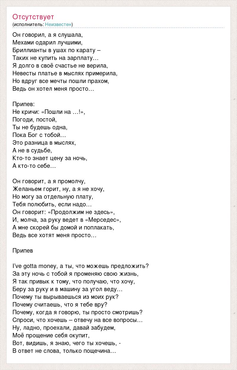 Он говорил, а я слушала, Мехами одарил лучшими, Бриллианты в ушах по карату – Таких не купить на зарплату… Я долго в своё счастье не верила, Невесты платье в мыслях примерила, Но вдруг все мечты пошли прахом, Ведь он хотел меня просто… Припев: Не кричи: «Пошли на …!», Погоди, постой, Ты не будешь одна, Пока Бог с тобой… Это разница в мыслях, А не в судьбе, Кто-то знает цену за ночь, А кто-то себе… Он говорит, а я промолчу, Желаньем горит, ну, а я не хочу, Но могу за отдельную плату, Тебя полюбить, если надо… Он говорит: «Продолжим не здесь», И, молча, за руку ведет в «Мерседес», А мне скорей бы домой и поплакать, Ведь все хотят меня просто… Припев I’ve gotta money, а ты, что можешь предложить? За эту ночь с тобой я променяю свою жизнь, Я так привык к тому, что получаю, что хочу, Беру за руку и в машину за угол веду… Почему ты вырываешься из моих рук? Почему считаешь, что я тебе вру? Почему, когда я говорю, ты просто смотришь? Спроси, что хочешь – отвечу на все вопросы… Ну, ладно, проехали, давай забудем, Моё прощение себя окупит, Вот, видишь, я знаю, чего ты хочешь, - В ответ не слова, только пощечина…