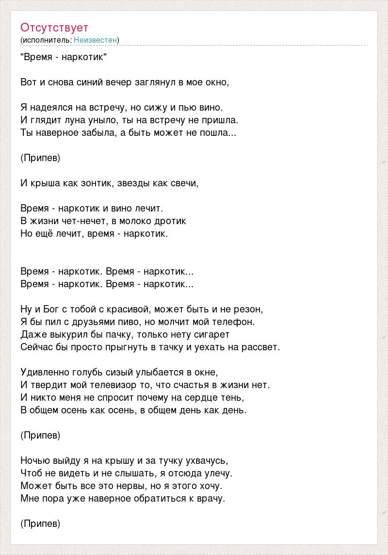 "Время - наркотик" Вот и снова синий вечер заглянул в мое окно, Я надеялся на встречу, но сижу и пью вино. И глядит луна уныло, ты на встречу не пришла. Ты наверное забыла, а быть может не пошла... (Припев) И крыша как зонтик, звезды как свечи, Время - наркотик и вино лечит. В жизни чет-нечет, в молоко дротик Но ещё лечит, время - наркотик. Время - наркотик. Время - наркотик... Время - наркотик. Время - наркотик... Ну и Бог с тобой с красивой, может быть и не резон, Я бы пил с друзьями пиво, но молчит мой телефон. Даже выкурил бы пачку, только нету сигарет Сейчас бы просто прыгнуть в тачку и уехать на рассвет. Удивленно голубь сизый улыбается в окне, И твердит мой телевизор то, что счастья в жизни нет. И никто меня не спросит почему на сердце тень, В общем осень как осень, в общем день как день. (Припев) Ночью выйду я на крышу и за тучку ухвачусь, Чтоб не видеть и не слышать, я отсюда улечу. Может быть все это нервы, но я этого хочу. Мне пора уже наверное обратиться к врачу. (Припев)