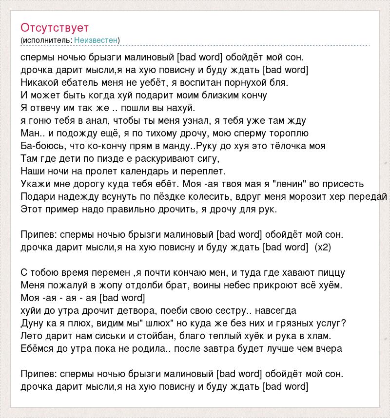 спермы ночью брызги малиновый [bad word] обойдёт мой сон. дрочка дарит мысли,я на хую повисну и буду ждать [bad word] Никакой ебатель меня не уебёт, я воспитан порнухой бля. И может быть когда хуй подарит моим близким кончу Я отвечу им так же .. пошли вы нахуй. я гоню тебя в анал, чтобы ты меня узнал, я тебя уже там жду Ман.. и подожду ещё, я по тихому дрочу, мою сперму тороплю Ба-боюсь, что ко-кончу прям в манду..Руку до хуя это тёлочка моя Там где дети по пизде е раскуривают сигу, Наши ночи на пролет календарь и переплет. Укажи мне дорогу куда тебя ебёт. Моя -ая твоя мая я "ленин" во присесть Подари надежду всунуть по пёздке колесить, вдруг меня морозит хер передай Этот пример надо правильно дрочить, я дрочу для рук. Припев: спермы ночью брызги малиновый [bad word] обойдёт мой сон. дрочка дарит мысли,я на хую повисну и буду ждать [bad word] (х2) С тобою время перемен ,я почти кончаю мен, и туда где хавают пиццу Меня пожалуй в жопу отдолби брат, воины небес прикроют всё хуём. Моя -ая - ая - ая [bad word] хуйи до утра дрочит детвора, поеби свою сестру.. навсегда Дуну ка я плюх, видим мы" шлюх" но куда же без них и грязных услуг? Лето дарит нам сиськи и стойбан, благо теплый хуёк и рука в хлам. Ебёмся до утра пока не родила.. после завтра будет лучше чем вчера Припев: спермы ночью брызги малиновый [bad word] обойдёт мой сон. дрочка дарит мысли,я на хую повисну и буду ждать [bad word]