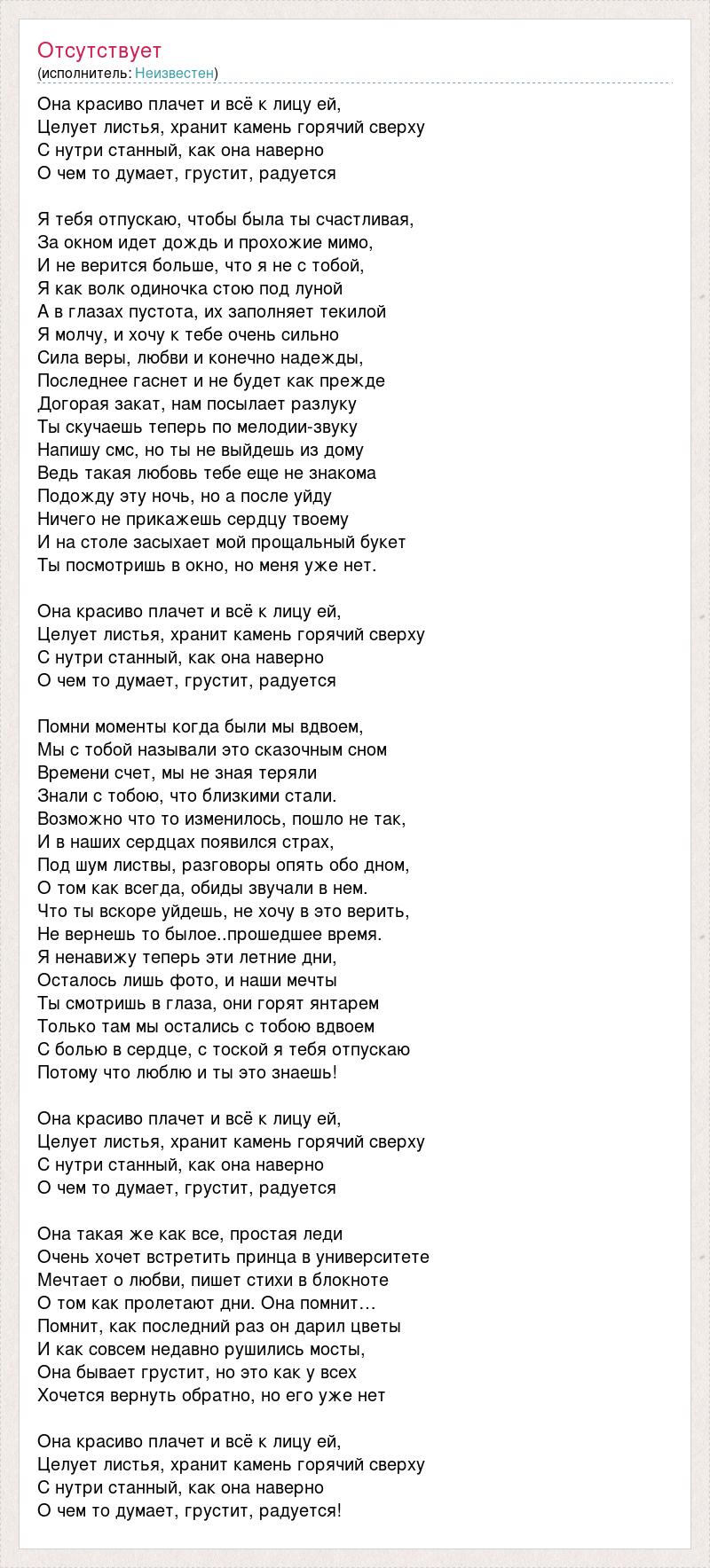 Она красиво плачет и всё к лицу ей, Целует листья, хранит камень горячий сверху С нутри станный, как она наверно О чем то думает, грустит, радуется Я тебя отпускаю, чтобы была ты счастливая, За окном идет дождь и прохожие мимо, И не верится больше, что я не с тобой, Я как волк одиночка стою под луной А в глазах пустота, их заполняет текилой Я молчу, и хочу к тебе очень сильно Сила веры, любви и конечно надежды, Последнее гаснет и не будет как прежде Догорая закат, нам посылает разлуку Ты скучаешь теперь по мелодии-звуку Напишу смс, но ты не выйдешь из дому Ведь такая любовь тебе еще не знакома Подожду эту ночь, но а после уйду Ничего не прикажешь сердцу твоему И на столе засыхает мой прощальный букет Ты посмотришь в окно, но меня уже нет. Она красиво плачет и всё к лицу ей, Целует листья, хранит камень горячий сверху С нутри станный, как она наверно О чем то думает, грустит, радуется Помни моменты когда были мы вдвоем, Мы с тобой называли это сказочным сном Времени счет, мы не зная теряли Знали с тобою, что близкими стали. Возможно что то изменилось, пошло не так, И в наших сердцах появился страх, Под шум листвы, разговоры опять обо дном, О том как всегда, обиды звучали в нем. Что ты вскоре уйдешь, не хочу в это верить, Не вернешь то былое..прошедшее время. Я ненавижу теперь эти летние дни, Осталось лишь фото, и наши мечты Ты смотришь в глаза, они горят янтарем Только там мы остались с тобою вдвоем С болью в сердце, с тоской я тебя отпускаю Потому что люблю и ты это знаешь! Она красиво плачет и всё к лицу ей, Целует листья, хранит камень горячий сверху С нутри станный, как она наверно О чем то думает, грустит, радуется Она такая же как все, простая леди Очень хочет встретить принца в университете Мечтает о любви, пишет стихи в блокноте О том как пролетают дни. Она помнит… Помнит, как последний раз он дарил цветы И как совсем недавно рушились мосты, Она бывает грустит, но это как у всех Хочется вернуть обратно, но его уже нет Она красиво плачет и всё к лицу ей, Целует листья, хранит камень горячий сверху С нутри станный, как она наверно О чем то думает, грустит, радуется!