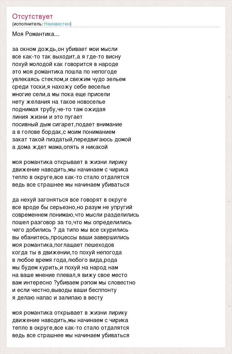 Моя Романтика... за окном дождь,он убивает мои мысли все как-то так выходит,а я где-то висну похуй молодой как говорится в народе это моя романтика пошла по непогоде увлекаясь стеклом,и свежим чудо зельем среди тоски,я нахожу себе веселье многие сели,а мы пока еще присели нету желания на такое новоселье поднимая трубу,че-то там ожидая линия жизни и это пугает посивный дым сигарет,подает внимание а в голове бордак,с моим пониманием закат такой пиздатый,передвигаюсь домой а дома ждет мама,опять я никакой моя романтика открывает в жизни лирику движение наводить,мы начинаем с чирика тепло в округе,все как-то стало отдалятся ведь все страшнее мы начинаем убиваться да нехуй загоняться все говорят в округе все вроде бы серьезно,но разум не упругий современнем понимаю,что мысли разделились пошел разговор за то,что мы определились чего добились ? да типо мы все скурились вы ебанитесь,процессы ваши завершились моя романтика,поглащает пешеходов когда ты в движении,то похуй непогода в любое время года,любого вида,рода мы будем курить,и похуй на народ нам на ваше мнение плевал,я вижу свое место вам интересно ?убиваем рэпом мы словестно и если честно,выводы ваши бесппонту я делаю напас и залипаю в весту моя романтика открывает в жизни лирику движение наводить,мы начинаем с чирика тепло в округе,все как-то стало отдалятся ведь все страшнее мы начинаем убиваться