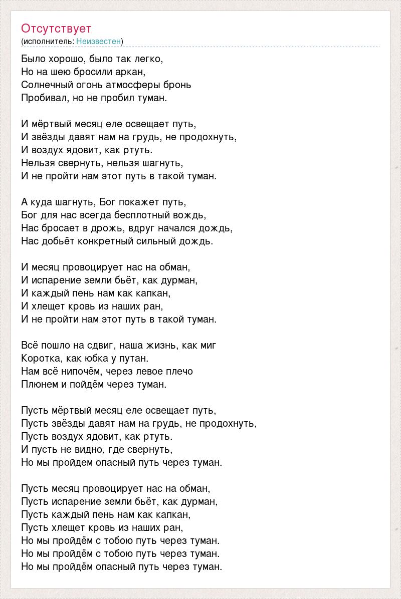 Было хорошо, было так легко, Но на шею бросили аркан, Солнечный огонь атмосферы бронь Пробивал, но не пробил туман. И мёртвый месяц еле освещает путь, И звёзды давят нам на грудь, не продохнуть, И воздух ядовит, как ртуть. Нельзя свернуть, нельзя шагнуть, И не пройти нам этот путь в такой туман. А куда шагнуть, Бог покажет путь, Бог для нас всегда бесплотный вождь, Нас бросает в дрожь, вдруг начался дождь, Нас добьёт конкретный сильный дождь. И месяц провоцирует нас на обман, И испарение земли бьёт, как дурман, И каждый пень нам как капкан, И хлещет кровь из наших ран, И не пройти нам этот путь в такой туман. Всё пошло на сдвиг, наша жизнь, как миг Коротка, как юбка у путан. Нам всё нипочём, через левое плечо Плюнем и пойдём через туман. Пусть мёртвый месяц еле освещает путь, Пусть звёзды давят нам на грудь, не продохнуть, Пусть воздух ядовит, как ртуть. И пусть не видно, где свернуть, Но мы пройдем опасный путь через туман. Пусть месяц провоцирует нас на обман, Пусть испарение земли бьёт, как дурман, Пусть каждый пень нам как капкан, Пусть хлещет кровь из наших ран, Но мы пройдём с тобою путь через туман. Но мы пройдём с тобою путь через туман. Но мы пройдём опасный путь через туман.
