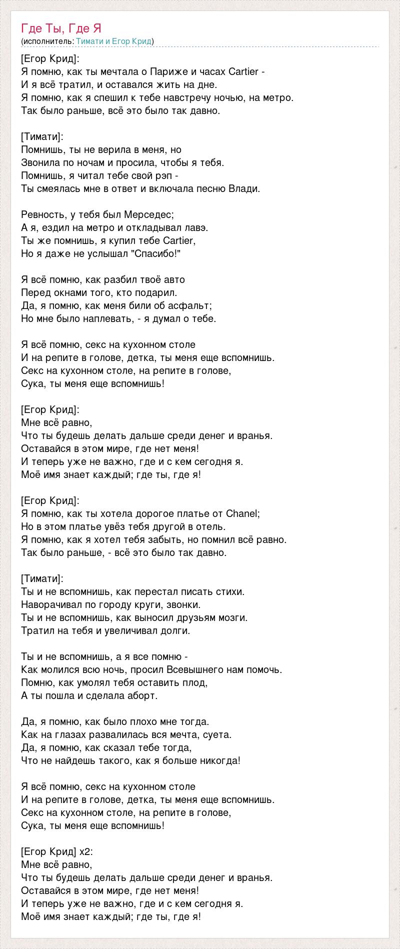 [Егор Крид]: Я помню, как ты мечтала о Париже и часах Cartier - И я всё тратил, и оставался жить на дне. Я помню, как я спешил к тебе навстречу ночью, на метро. Так было раньше, всё это было так давно. [Тимати]: Помнишь, ты не верила в меня, но Звонила по ночам и просила, чтобы я тебя. Помнишь, я читал тебе свой рэп - Ты смеялась мне в ответ и включала песню Влади. Ревность, у тебя был Мерседес; А я, ездил на метро и откладывал лавэ. Ты же помнишь, я купил тебе Cartier, Но я даже не услышал "Спасибо!" Я всё помню, как разбил твоё авто Перед окнами того, кто подарил. Да, я помню, как меня били об асфальт; Но мне было наплевать, - я думал о тебе. Я всё помню, секс на кухонном столе И на репите в голове, детка, ты меня еще вспомнишь. Секс на кухонном столе, на репите в голове, Сука, ты меня еще вспомнишь! [Егор Крид]: Мне всё равно, Что ты будешь делать дальше среди денег и вранья. Оставайся в этом мире, где нет меня! И теперь уже не важно, где и с кем сегодня я. Моё имя знает каждый; где ты, где я! [Егор Крид]: Я помню, как ты хотела дорогое платье от Chanel; Но в этом платье увёз тебя другой в отель. Я помню, как я хотел тебя забыть, но помнил всё равно. Так было раньше, - всё это было так давно. [Тимати]: Ты и не вспомнишь, как перестал писать стихи. Наворачивал по городу круги, звонки. Ты и не вспомнишь, как выносил друзьям мозги. Тратил на тебя и увеличивал долги. Ты и не вспомнишь, а я все помню - Как молился всю ночь, просил Всевышнего нам помочь. Помню, как умолял тебя оставить плод, А ты пошла и сделала аборт. Да, я помню, как было плохо мне тогда. Как на глазах развалилась вся мечта, суета. Да, я помню, как сказал тебе тогда, Что не найдешь такого, как я больше никогда! Я всё помню, секс на кухонном столе И на репите в голове, детка, ты меня еще вспомнишь. Секс на кухонном столе, на репите в голове, Сука, ты меня еще вспомнишь! [Егор Крид] х2: Мне всё равно, Что ты будешь делать дальше среди денег и вранья. Оставайся в этом мире, где нет меня! И теперь уже не важно, где и с кем сегодня я. Моё имя знает каждый; где ты, где я!