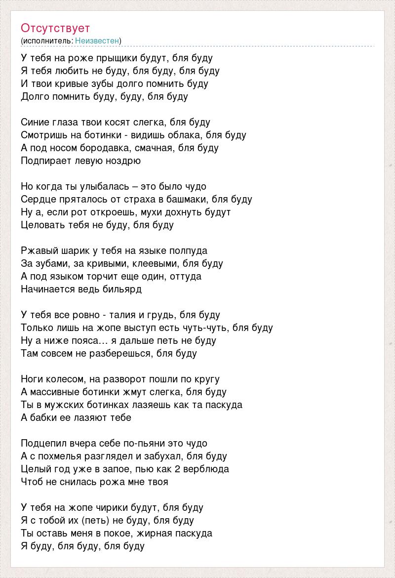 У тебя на роже прыщики будут, бля буду Я тебя любить не буду, бля буду, бля буду И твои кривые зубы долго помнить буду Долго помнить буду, буду, бля буду Синие глаза твои косят слегка, бля буду Смотришь на ботинки - видишь облака, бля буду А под носом бородавка, смачная, бля буду Подпирает левую ноздрю Но когда ты улыбалась – это было чудо Сердце пряталось от страха в башмаки, бля буду Ну а, если рот откроешь, мухи дохнуть будут Целовать тебя не буду, бля буду Ржавый шарик у тебя на языке полпуда За зубами, за кривыми, клеевыми, бля буду А под языком торчит еще один, оттуда Начинается ведь бильярд У тебя все ровно - талия и грудь, бля буду Только лишь на жопе выступ есть чуть-чуть, бля буду Ну а ниже пояса… я дальше петь не буду Там совсем не разберешься, бля буду Ноги колесом, на разворот пошли по кругу А массивные ботинки жмут слегка, бля буду Ты в мужских ботинках лазяешь как та паскуда А бабки ее лазяют тебе Подцепил вчера себе по-пьяни это чудо А с похмелья разглядел и забухал, бля буду Целый год уже в запое, пью как 2 верблюда Чтоб не снилась рожа мне твоя У тебя на жопе чирики будут, бля буду Я с тобой их (петь) не буду, бля буду Ты оставь меня в покое, жирная паскуда Я буду, бля буду, бля буду