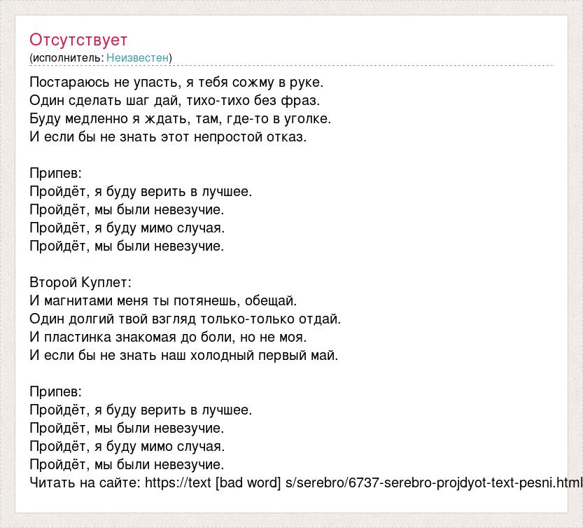 Постараюсь не упасть, я тебя сожму в руке. Один сделать шаг дай, тихо-тихо без фраз. Буду медленно я ждать, там, где-то в уголке. И если бы не знать этот непростой отказ. Припев: Пройдёт, я буду верить в лучшее. Пройдёт, мы были невезучие. Пройдёт, я буду мимо случая. Пройдёт, мы были невезучие. Второй Куплет: И магнитами меня ты потянешь, обещай. Один долгий твой взгляд только-только отдай. И пластинка знакомая до боли, но не моя. И если бы не знать наш холодный первый май. Припев: Пройдёт, я буду верить в лучшее. Пройдёт, мы были невезучие. Пройдёт, я буду мимо случая. Пройдёт, мы были невезучие. Читать на сайте: https://text [bad word] s/serebro/6737-serebro-projdyot-text-pesni.html
