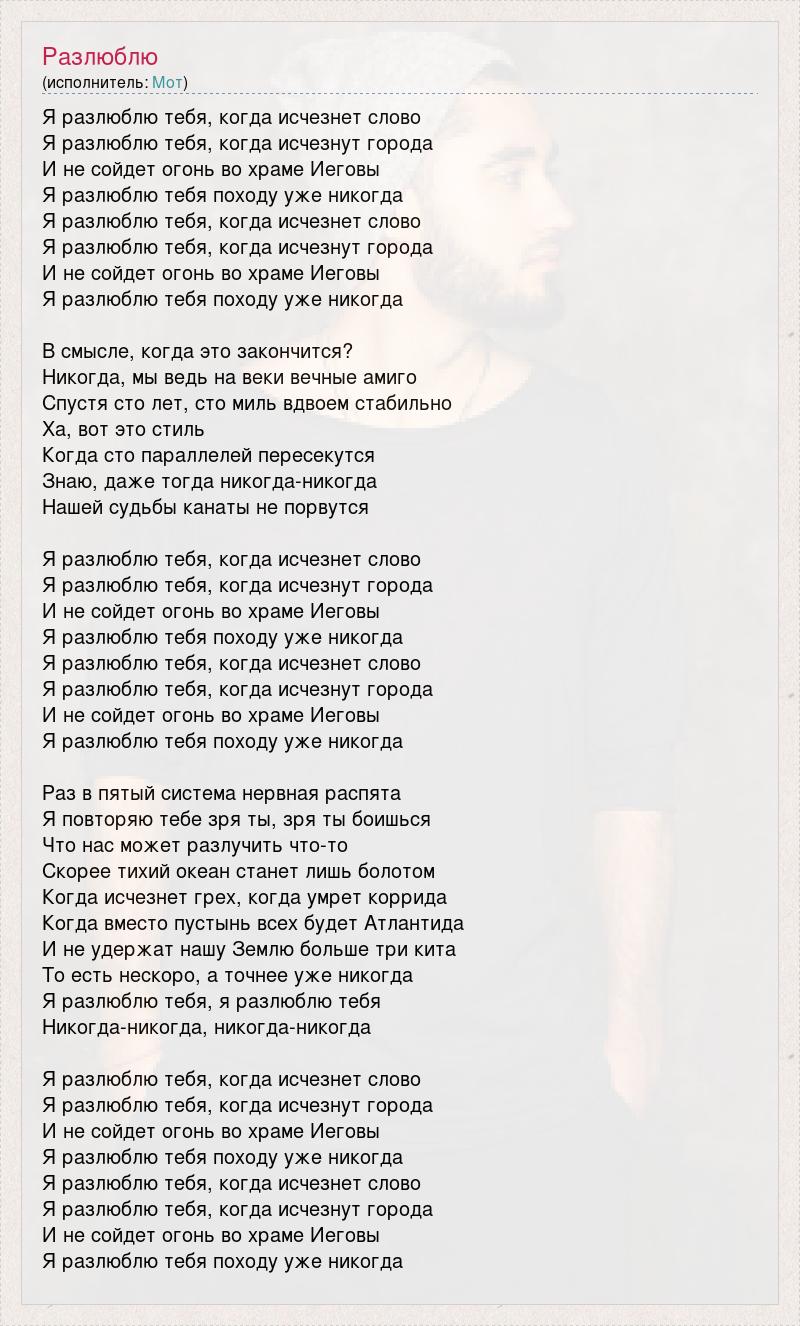 Я разлюблю тебя, когда исчезнет слово Я разлюблю тебя, когда исчезнут города И не сойдет огонь во храме Иеговы Я разлюблю тебя походу уже никогда Я разлюблю тебя, когда исчезнет слово Я разлюблю тебя, когда исчезнут города И не сойдет огонь во храме Иеговы Я разлюблю тебя походу уже никогда В смысле, когда это закончится? Никогда, мы ведь на веки вечные амиго Спустя сто лет, сто миль вдвоем стабильно Ха, вот это стиль Когда сто параллелей пересекутся Знаю, даже тогда никогда-никогда Нашей судьбы канаты не порвутся Я разлюблю тебя, когда исчезнет слово Я разлюблю тебя, когда исчезнут города И не сойдет огонь во храме Иеговы Я разлюблю тебя походу уже никогда Я разлюблю тебя, когда исчезнет слово Я разлюблю тебя, когда исчезнут города И не сойдет огонь во храме Иеговы Я разлюблю тебя походу уже никогда Раз в пятый система нервная распята Я повторяю тебе зря ты, зря ты боишься Что нас может разлучить что-то Скорее тихий океан станет лишь болотом Когда исчезнет грех, когда умрет коррида Когда вместо пустынь всех будет Атлантида И не удержат нашу Землю больше три кита То есть нескоро, а точнее уже никогда Я разлюблю тебя, я разлюблю тебя Никогда-никогда, никогда-никогда Я разлюблю тебя, когда исчезнет слово Я разлюблю тебя, когда исчезнут города И не сойдет огонь во храме Иеговы Я разлюблю тебя походу уже никогда Я разлюблю тебя, когда исчезнет слово Я разлюблю тебя, когда исчезнут города И не сойдет огонь во храме Иеговы Я разлюблю тебя походу уже никогда