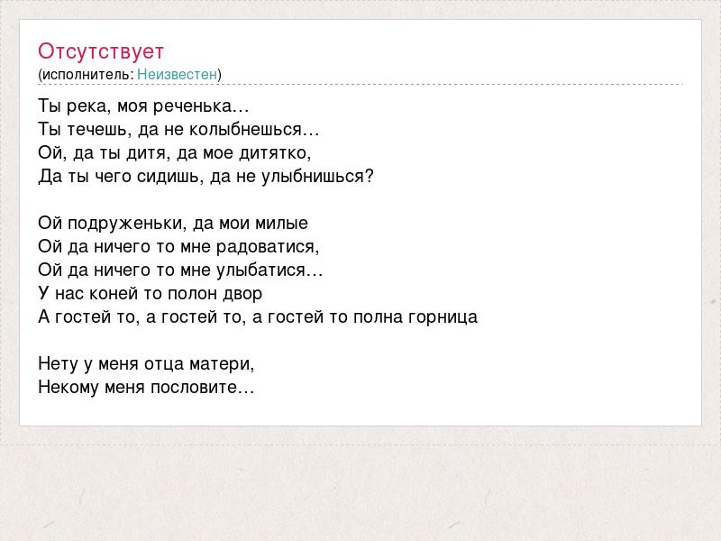 Ты река, моя реченька… Ты течешь, да не колыбнешься… Ой, да ты дитя, да мое дитятко, Да ты чего сидишь, да не улыбнишься? Ой подруженьки, да мои милые Ой да ничего то мне радоватися, Ой да ничего то мне улыбатися… У нас коней то полон двор А гостей то, а гостей то, а гостей то полна горница Нету у меня отца матери, Некому меня пословите…