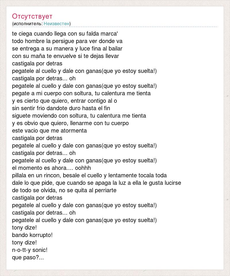 te ciega cuando llega con su falda marca' todo hombre la persigue para ver donde va se entrega a su manera y luce fina al bailar con su maña te envuelve si te dejas llevar castigala por detras pegatele al cuello y dale con ganas(que yo estoy suelta!) castigala por detras... oh pegatele al cuello y dale con ganas(que yo estoy suelta!) pegate a mi cuerpo con soltura, tu calentura me tienta y es cierto que quiero, entrar contigo al o sin sentir frio dandote duro hasta el fin siguete moviendo con soltura, tu calentura me tienta y es obvio que quiero, llenarme con tu cuerpo este vacio que me atormenta castigala por detras pegatele al cuello y dale con ganas(que yo estoy suelta!) castigala por detras... oh pegatele al cuello y dale con ganas(que yo estoy suelta!) el momento es ahora.... oohhh pillala en un rincon, besale el cuello y lentamente tocala toda dale lo que pide, que cuando se apaga la luz a ella le gusta lucirse de todo se olvida, no se quita al perriarte castigala por detras pegatele al cuello y dale con ganas(que yo estoy suelta!) castigala por detras... oh pegatele al cuello y dale con ganas(que yo estoy suelta!) tony dize! bando korrupto! tony dize! n-o-tt-y sonic! que paso?...