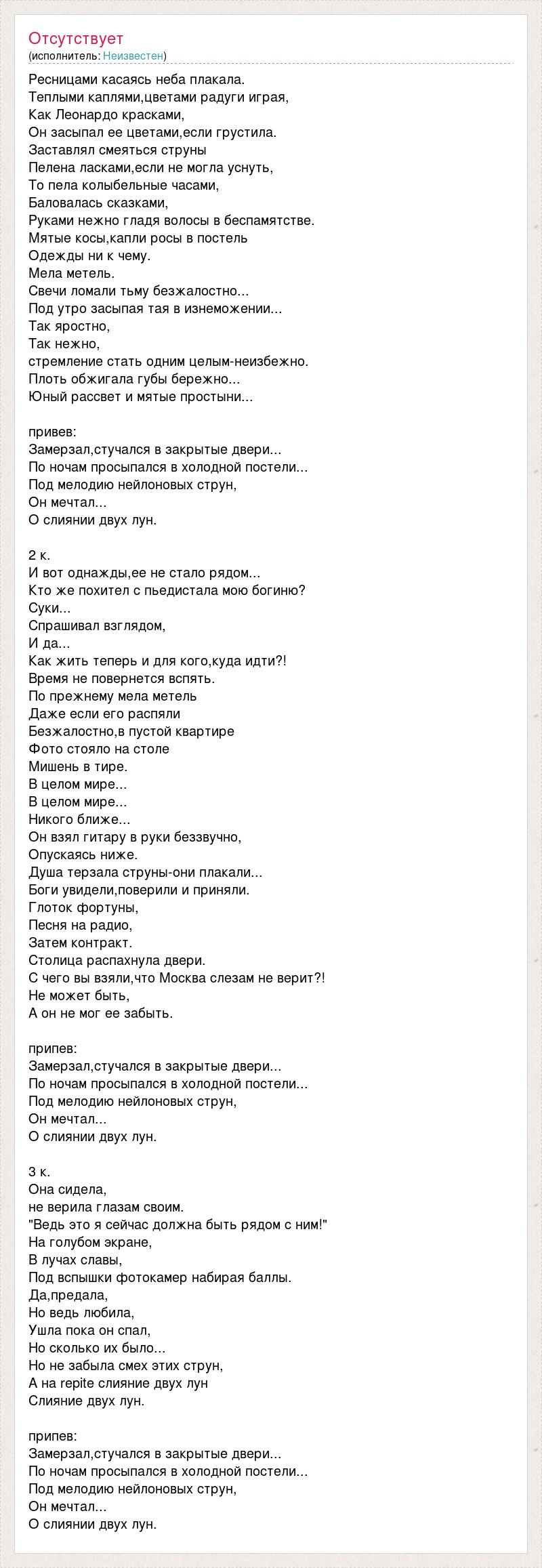 Ресницами касаясь неба плакала. Теплыми каплями,цветами радуги играя, Как Леонардо красками, Он засыпал ее цветами,если грустила. Заставлял смеяться струны Пелена ласками,если не могла уснуть, То пела колыбельные часами, Баловалась сказками, Руками нежно гладя волосы в беспамятстве. Мятые косы,капли росы в постель Одежды ни к чему. Мела метель. Свечи ломали тьму безжалостно... Под утро засыпая тая в изнеможении... Так яростно, Так нежно, стремление стать одним целым-неизбежно. Плоть обжигала губы бережно... Юный рассвет и мятые простыни... привев: Замерзал,стучался в закрытые двери... По ночам просыпался в холодной постели... Под мелодию нейлоновых струн, Он мечтал... О слиянии двух лун. 2 к. И вот однажды,ее не стало рядом... Кто же похител с пьедистала мою богиню? Суки... Спрашивал взглядом, И да... Как жить теперь и для кого,куда идти?! Время не повернется вспять. По прежнему мела метель Даже если его распяли Безжалостно,в пустой квартире Фото стояло на столе Мишень в тире. В целом мире... В целом мире... Никого ближе... Он взял гитару в руки беззвучно, Опускаясь ниже. Душа терзала струны-они плакали... Боги увидели,поверили и приняли. Глоток фортуны, Песня на радио, Затем контракт. Столица распахнула двери. С чего вы взяли,что Москва слезам не верит?! Не может быть, А он не мог ее забыть. припев: Замерзал,стучался в закрытые двери... По ночам просыпался в холодной постели... Под мелодию нейлоновых струн, Он мечтал... О слиянии двух лун. 3 к. Она сидела, не верила глазам своим. "Ведь это я сейчас должна быть рядом с ним!" На голубом экране, В лучах славы, Под вспышки фотокамер набирая баллы. Да,предала, Но ведь любила, Ушла пока он спал, Но сколько их было... Но не забыла смех этих струн, А на repite слияние двух лун Слияние двух лун. припев: Замерзал,стучался в закрытые двери... По ночам просыпался в холодной постели... Под мелодию нейлоновых струн, Он мечтал... О слиянии двух лун.