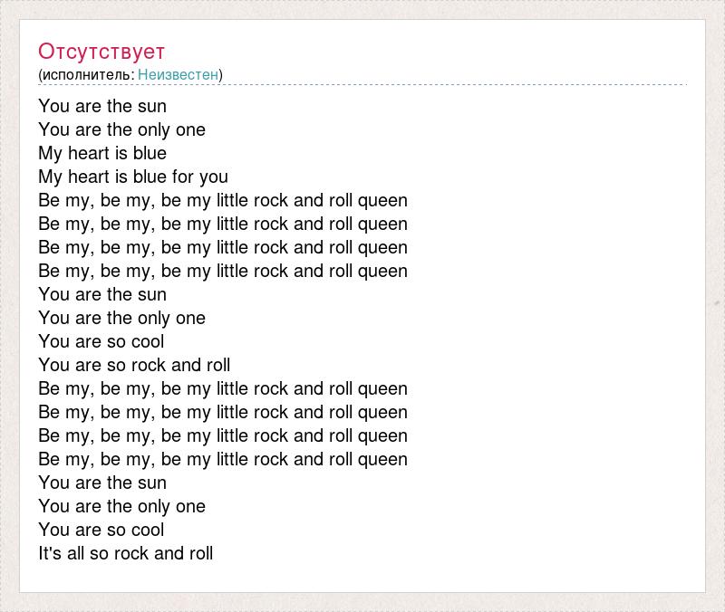 You are the sun You are the only one My heart is blue My heart is blue for you Be my, be my, be my little rock and roll queen Be my, be my, be my little rock and roll queen Be my, be my, be my little rock and roll queen Be my, be my, be my little rock and roll queen You are the sun You are the only one You are so cool You are so rock and roll Be my, be my, be my little rock and roll queen Be my, be my, be my little rock and roll queen Be my, be my, be my little rock and roll queen Be my, be my, be my little rock and roll queen You are the sun You are the only one You are so cool It's all so rock and roll