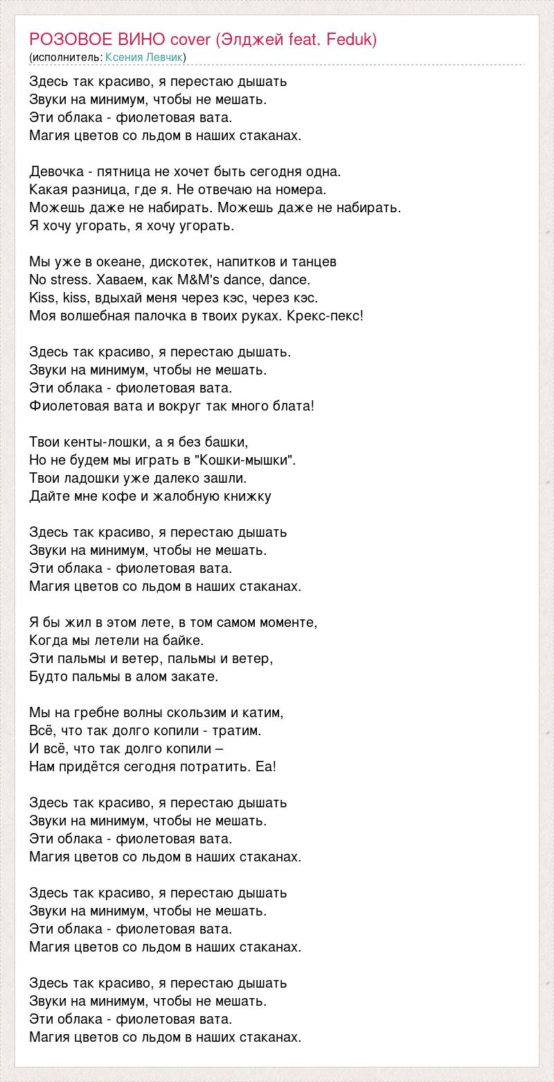 Здесь так красиво, я перестаю дышать Звуки на минимум, чтобы не мешать. Эти облака - фиолетовая вата. Магия цветов со льдом в наших стаканах. Девочка - пятница не хочет быть сегодня одна. Какая разница, где я. Не отвечаю на номера. Можешь даже не набирать. Можешь даже не набирать. Я хочу угорать, я хочу угорать. Мы уже в океане, дискотек, напитков и танцев No stress. Хаваем, как M&M's dance, dance. Kiss, kiss, вдыхай меня через кэс, через кэс. Моя волшебная палочка в твоих руках. Крекс-пекс! Здесь так красиво, я перестаю дышать. Звуки на минимум, чтобы не мешать. Эти облака - фиолетовая вата. Фиолетовая вата и вокруг так много блата! Твои кенты-лошки, а я без башки, Но не будем мы играть в "Кошки-мышки". Твои ладошки уже далеко зашли. Дайте мне кофе и жалобную книжку Здесь так красиво, я перестаю дышать Звуки на минимум, чтобы не мешать. Эти облака - фиолетовая вата. Магия цветов со льдом в наших стаканах. Я бы жил в этом лете, в том самом моменте, Когда мы летели на байке. Эти пальмы и ветер, пальмы и ветер, Будто пальмы в алом закате. Мы на гребне волны скользим и катим, Всё, что так долго копили - тратим. И всё, что так долго копили – Нам придётся сегодня потратить. Еа! Здесь так красиво, я перестаю дышать Звуки на минимум, чтобы не мешать. Эти облака - фиолетовая вата. Магия цветов со льдом в наших стаканах. Здесь так красиво, я перестаю дышать Звуки на минимум, чтобы не мешать. Эти облака - фиолетовая вата. Магия цветов со льдом в наших стаканах. Здесь так красиво, я перестаю дышать Звуки на минимум, чтобы не мешать. Эти облака - фиолетовая вата. Магия цветов со льдом в наших стаканах.