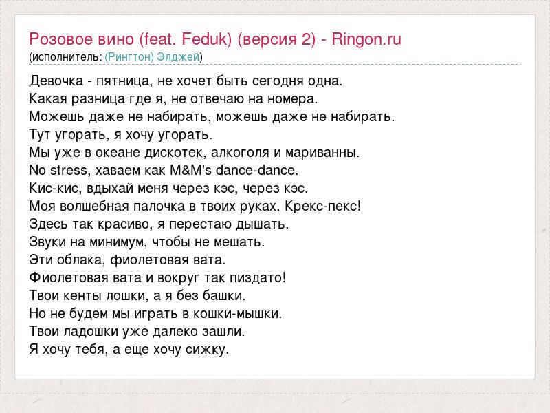 Девочка - пятница, не хочет быть сегодня одна. Какая разница где я, не отвечаю на номера. Можешь даже не набирать, можешь даже не набирать. Тут угорать, я хочу угорать. Мы уже в океане дискотек, алкоголя и мариванны. No stress, хаваем как M&M's dance-dance. Кис-кис, вдыхай меня через кэс, через кэс. Моя волшебная палочка в твоих руках. Крекс-пекс! Здесь так красиво, я перестаю дышать. Звуки на минимум, чтобы не мешать. Эти облака, фиолетовая вата. Фиолетовая вата и вокруг так пиздато! Твои кенты лошки, а я без башки. Но не будем мы играть в кошки-мышки. Твои ладошки уже далеко зашли. Я хочу тебя, а еще хочу сижку.