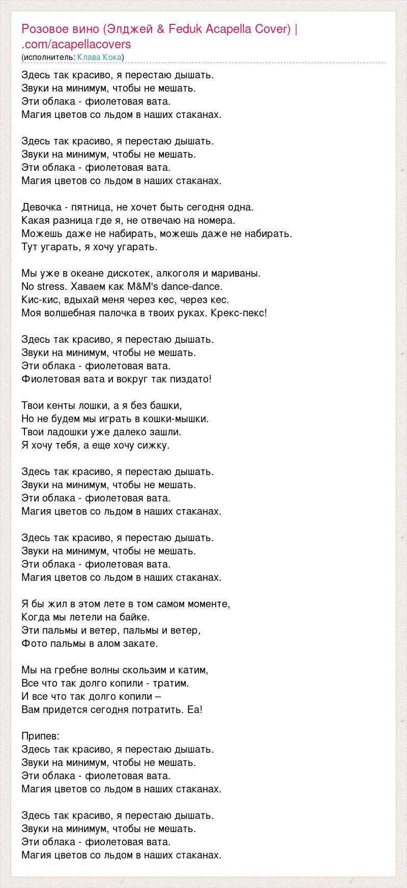 Здесь так красиво, я перестаю дышать. Звуки на минимум, чтобы не мешать. Эти облака - фиолетовая вата. Магия цветов со льдом в наших стаканах. Здесь так красиво, я перестаю дышать. Звуки на минимум, чтобы не мешать. Эти облака - фиолетовая вата. Магия цветов со льдом в наших стаканах. Девочка - пятница, не хочет быть сегодня одна. Какая разница где я, не отвечаю на номера. Можешь даже не набирать, можешь даже не набирать. Тут угарать, я хочу угарать. Мы уже в океане дискотек, алкоголя и мариваны. No stress. Хаваем как M&M's dance-dance. Кис-кис, вдыхай меня через кес, через кес. Моя волшебная палочка в твоих руках. Крекс-пекс! Здесь так красиво, я перестаю дышать. Звуки на минимум, чтобы не мешать. Эти облака - фиолетовая вата. Фиолетовая вата и вокруг так пиздато! Твои кенты лошки, а я без башки, Но не будем мы играть в кошки-мышки. Твои ладошки уже далеко зашли. Я хочу тебя, а еще хочу сижку. Здесь так красиво, я перестаю дышать. Звуки на минимум, чтобы не мешать. Эти облака - фиолетовая вата. Магия цветов со льдом в наших стаканах. Здесь так красиво, я перестаю дышать. Звуки на минимум, чтобы не мешать. Эти облака - фиолетовая вата. Магия цветов со льдом в наших стаканах. Я бы жил в этом лете в том самом моменте, Когда мы летели на байке. Эти пальмы и ветер, пальмы и ветер, Фото пальмы в алом закате. Мы на гребне волны скользим и катим, Все что так долго копили - тратим. И все что так долго копили – Вам придется сегодня потратить. Еа! Припев: Здесь так красиво, я перестаю дышать. Звуки на минимум, чтобы не мешать. Эти облака - фиолетовая вата. Магия цветов со льдом в наших стаканах. Здесь так красиво, я перестаю дышать. Звуки на минимум, чтобы не мешать. Эти облака - фиолетовая вата. Магия цветов со льдом в наших стаканах.