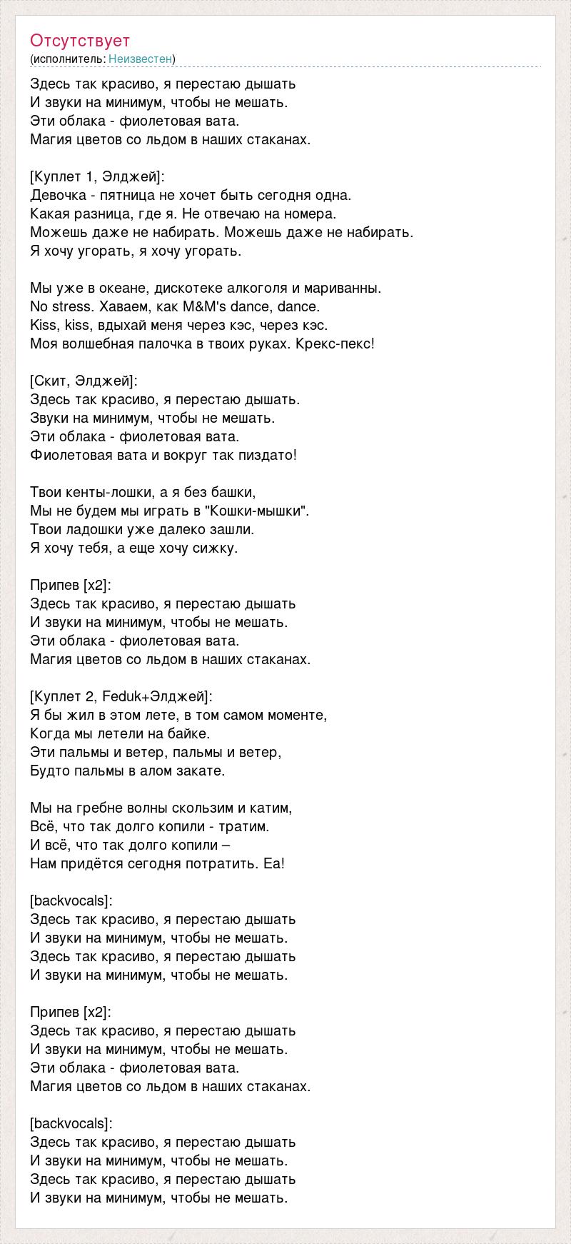 Здесь так красиво, я перестаю дышать И звуки на минимум, чтобы не мешать. Эти облака - фиолетовая вата. Магия цветов со льдом в наших стаканах. [Куплет 1, Элджей]: Девочка - пятница не хочет быть сегодня одна. Какая разница, где я. Не отвечаю на номера. Можешь даже не набирать. Можешь даже не набирать. Я хочу угорать, я хочу угорать. Мы уже в океане, дискотеке алкоголя и мариванны. No stress. Хаваем, как M&M's dance, dance. Kiss, kiss, вдыхай меня через кэс, через кэс. Моя волшебная палочка в твоих руках. Крекс-пекс! [Скит, Элджей]: Здесь так красиво, я перестаю дышать. Звуки на минимум, чтобы не мешать. Эти облака - фиолетовая вата. Фиолетовая вата и вокруг так пиздато! Твои кенты-лошки, а я без башки, Мы не будем мы играть в "Кошки-мышки". Твои ладошки уже далеко зашли. Я хочу тебя, а еще хочу сижку. Припев [x2]: Здесь так красиво, я перестаю дышать И звуки на минимум, чтобы не мешать. Эти облака - фиолетовая вата. Магия цветов со льдом в наших стаканах. [Куплет 2, Feduk+Элджей]: Я бы жил в этом лете, в том самом моменте, Когда мы летели на байке. Эти пальмы и ветер, пальмы и ветер, Будто пальмы в алом закате. Мы на гребне волны скользим и катим, Всё, что так долго копили - тратим. И всё, что так долго копили – Нам придётся сегодня потратить. Еа! [backvocals]: Здесь так красиво, я перестаю дышать И звуки на минимум, чтобы не мешать. Здесь так красиво, я перестаю дышать И звуки на минимум, чтобы не мешать. Припев [x2]: Здесь так красиво, я перестаю дышать И звуки на минимум, чтобы не мешать. Эти облака - фиолетовая вата. Магия цветов со льдом в наших стаканах. [backvocals]: Здесь так красиво, я перестаю дышать И звуки на минимум, чтобы не мешать. Здесь так красиво, я перестаю дышать И звуки на минимум, чтобы не мешать.