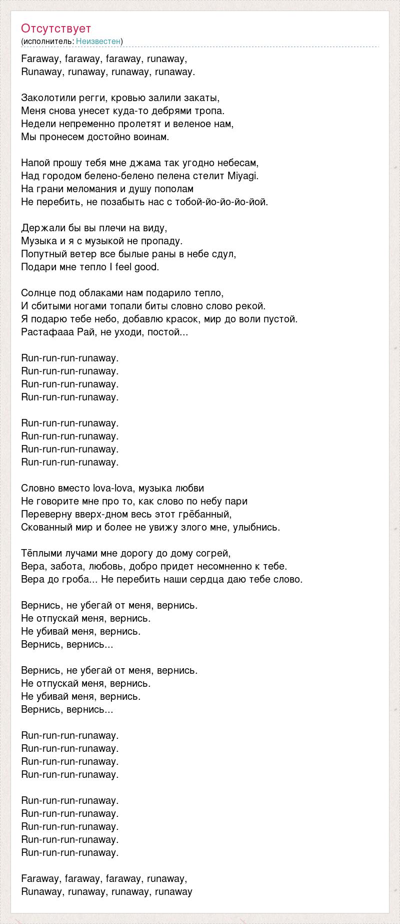 Faraway, faraway, faraway, runaway, Runaway, runaway, runaway, runaway. Заколотили регги, кровью залили закаты, Меня снова унесет куда-то дебрями тропа. Недели непременно пролетят и веленое нам, Мы пронесем достойно воинам. Напой прошу тебя мне джама так угодно небесам, Над городом белено-белено пелена стелит Miyagi. На грани меломания и душу пополам Не перебить, не позабыть нас с тобой-йо-йо-йо-йой. Держали бы вы плечи на виду, Музыка и я с музыкой не пропаду. Попутный ветер все былые раны в небе сдул, Подари мне тепло I feel good. Солнце под облаками нам подарило тепло, И сбитыми ногами топали биты словно слово рекой. Я подарю тебе небо, добавлю красок, мир до воли пустой. Растафааа Рай, не уходи, постой... Run-run-run-runaway. Run-run-run-runaway. Run-run-run-runaway. Run-run-run-runaway. Run-run-run-runaway. Run-run-run-runaway. Run-run-run-runaway. Run-run-run-runaway. Словно вместо lova-lova, музыка любви Не говорите мне про то, как слово по небу пари Переверну вверх-дном весь этот грёбанный, Скованный мир и более не увижу злого мне, улыбнись. Тёплыми лучами мне дорогу до дому согрей, Вера, забота, любовь, добро придет несомненно к тебе. Вера до гроба... Не перебить наши сердца даю тебе слово. Вернись, не убегай от меня, вернись. Не отпускай меня, вернись. Не убивай меня, вернись. Вернись, вернись... Вернись, не убегай от меня, вернись. Не отпускай меня, вернись. Не убивай меня, вернись. Вернись, вернись... Run-run-run-runaway. Run-run-run-runaway. Run-run-run-runaway. Run-run-run-runaway. Run-run-run-runaway. Run-run-run-runaway. Run-run-run-runaway. Run-run-run-runaway. Run-run-run-runaway. Faraway, faraway, faraway, runaway, Runaway, runaway, runaway, runaway