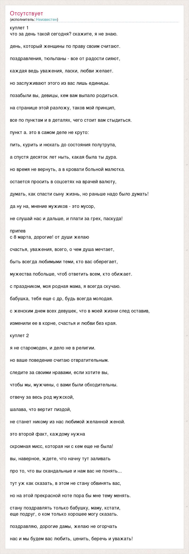 куплет 1 что за день такой сегодня? скажите, я не знаю. день, который женщины по праву своим считают. поздравления, тюльпаны - все от радости сияют, каждая ведь уважения, ласки, любви желает. но заслуживают этого из вас лишь единицы. позабыли вы, девицы, кем вам выпало родиться. на странице этой разложу, таков мой принцип, все по пунктам и в деталях, чего стоит вам стыдиться. пункт а. это в самом деле не круто: пить, курить и нюхать до состояния полутрупа, а спустя десяток лет ныть, какая была ты дура. но время не вернуть, а в кровати больной малютка. остается просить в соцсетях на врачей валюту, думать, как спасти сыну жизнь, но раньше надо было думать! да ну на, мнение мужиков - это мусор, не слушай нас и дальше, и плати за грех, паскуда! припев с 8 марта, дорогие! от души желаю счастья, уважения, всего, о чем душа мечтает, быть всегда любимыми теми, кто вас оберегает, мужества побольше, чтоб ответить всем, кто обижает. с праздником, моя родная мама, я всегда скучаю. бабушка, тебя еще с др, будь всегда молодая. с женским днем всех девушек, что в моей жизни след оставив, изменили ее в корне, счастья и любви без края. куплет 2 я не старомоден, и дело не в религии. но ваше поведение считаю отвратительным. следите за своими нравами, если хотите вы, чтобы мы, мужчины, с вами были обходительны. отвечу за весь род мужской, шалава, что вертит пиздой, не станет никому из нас любимой желанной женой. это второй факт, каждому нужна скромная мисс, которая ни с кем еще не была! вы, наверное, ждете, что начну тут заливать про то, что вы скандальные и нам вас не понять... тут уж как сказать, в этом не стану обвинять вас, но на этой прекрасной ноте пора бы мне тему менять. стану поздравлять только бабушку, маму, кстати, еще подруг, о ком только хорошее могу сказать. поздравляю, дорогие дамы, желаю не огорчать нас и мы будем вас любить, ценить, беречь и уважать!