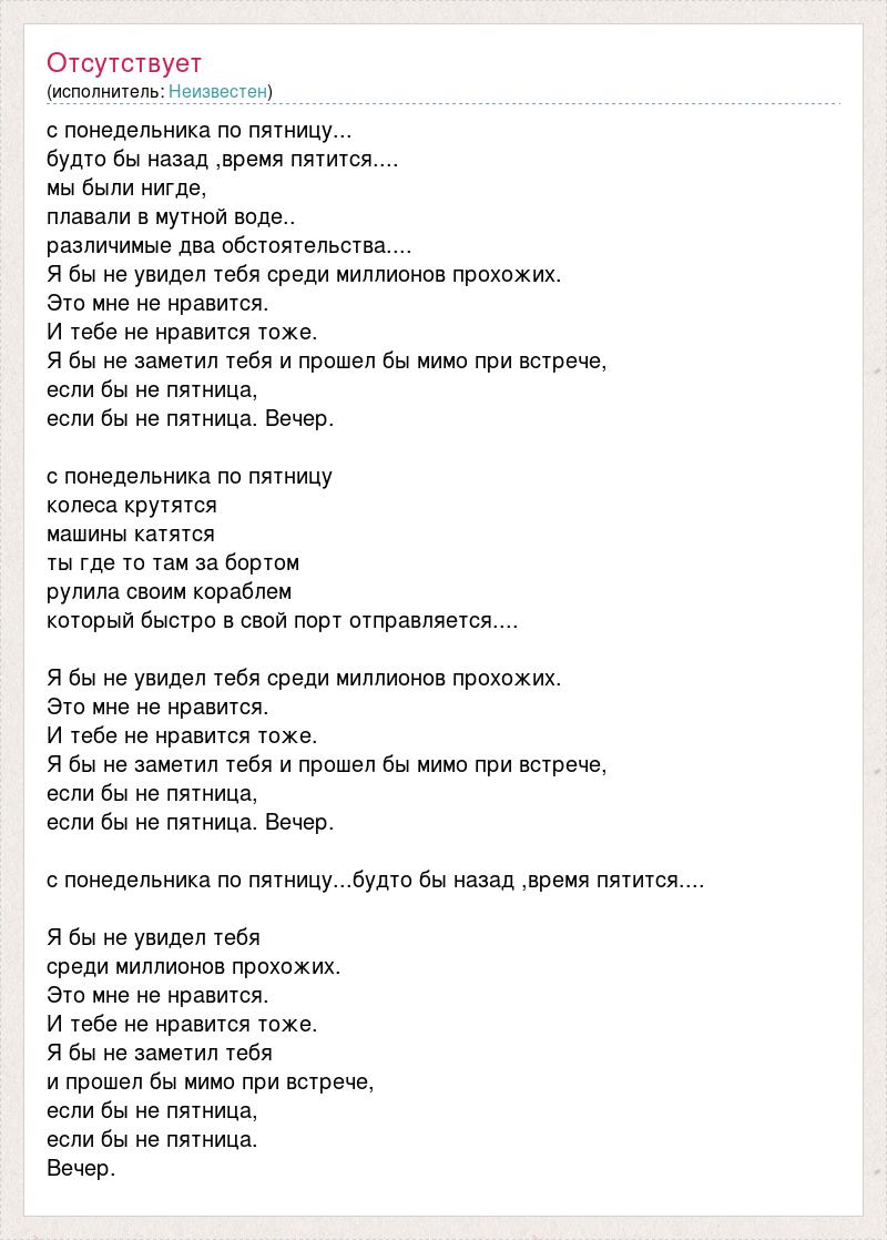 с понедельника по пятницу... будто бы назад ,время пятится.... мы были нигде, плавали в мутной воде.. различимые два обстоятельства.... Я бы не увидел тебя среди миллионов прохожих. Это мне не нравится. И тебе не нравится тоже. Я бы не заметил тебя и прошел бы мимо при встрече, если бы не пятница, если бы не пятница. Вечер. с понедельника по пятницу колеса крутятся машины катятся ты где то там за бортом рулила своим кораблем который быстро в свой порт отправляется.... Я бы не увидел тебя среди миллионов прохожих. Это мне не нравится. И тебе не нравится тоже. Я бы не заметил тебя и прошел бы мимо при встрече, если бы не пятница, если бы не пятница. Вечер. с понедельника по пятницу...будто бы назад ,время пятится.... Я бы не увидел тебя среди миллионов прохожих. Это мне не нравится. И тебе не нравится тоже. Я бы не заметил тебя и прошел бы мимо при встрече, если бы не пятница, если бы не пятница. Вечер.