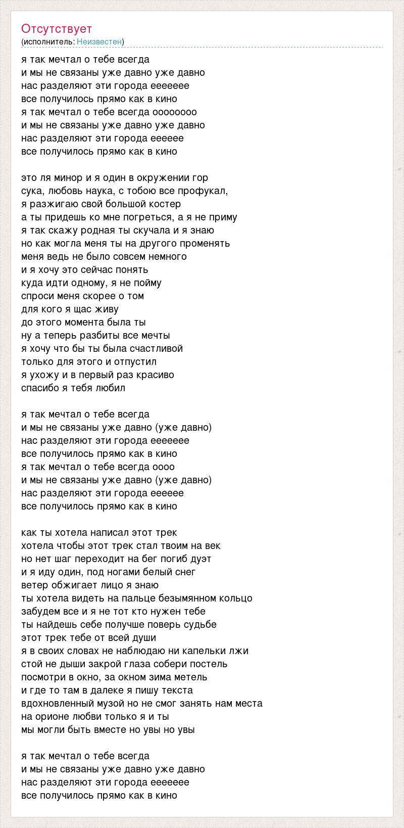 я так мечтал о тебе всегда и мы не связаны уже давно уже давно нас разделяют эти города еееееее все получилось прямо как в кино я так мечтал о тебе всегда оооооооо и мы не связаны уже давно уже давно нас разделяют эти города ееееее все получилось прямо как в кино это ля минор и я один в окружении гор сука, любовь наука, с тобою все профукал, я разжигаю свой большой костер а ты придешь ко мне погреться, а я не приму я так скажу родная ты скучала и я знаю но как могла меня ты на другого променять меня ведь не было совсем немного и я хочу это сейчас понять куда идти одному, я не пойму спроси меня скорее о том для кого я щас живу до этого момента была ты ну а теперь разбиты все мечты я хочу что бы ты была счастливой только для этого и отпустил я ухожу и в первый раз красиво спасибо я тебя любил я так мечтал о тебе всегда и мы не связаны уже давно (уже давно) нас разделяют эти города еееееее все получилось прямо как в кино я так мечтал о тебе всегда оооо и мы не связаны уже давно (уже давно) нас разделяют эти города ееееее все получилось прямо как в кино как ты хотела написал этот трек хотела чтобы этот трек стал твоим на век но нет шаг переходит на бег погиб дуэт и я иду один, под ногами белый снег ветер обжигает лицо я знаю ты хотела видеть на пальце безымянном кольцо забудем все и я не тот кто нужен тебе ты найдешь себе получше поверь судьбе этот трек тебе от всей души я в своих словах не наблюдаю ни капельки лжи стой не дыши закрой глаза собери постель посмотри в окно, за окном зима метель и где то там в далеке я пишу текста вдохновленный музой но не смог занять нам места на орионе любви только я и ты мы могли быть вместе но увы но увы я так мечтал о тебе всегда и мы не связаны уже давно уже давно нас разделяют эти города еееееее все получилось прямо как в кино
