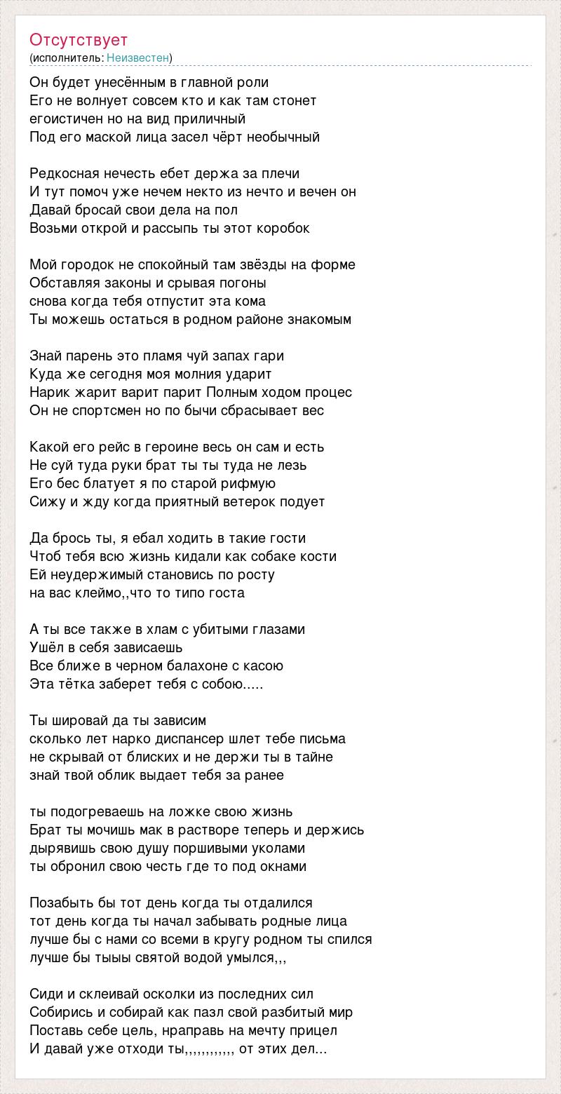 Он будет унесённым в главной роли Его не волнует совсем кто и как там стонет егоистичен но на вид приличный Под его маской лица засел чёрт необычный Редкосная нечесть ебет держа за плечи И тут помоч уже нечем некто из нечто и вечен он Давай бросай свои дела на пол Возьми открой и рассыпь ты этот коробок Мой городок не спокойный там звёзды на форме Обставляя законы и срывая погоны снова когда тебя отпустит эта кома Ты можешь остаться в родном районе знакомым Знай парень это пламя чуй запах гари Куда же сегодня моя молния ударит Нарик жарит варит парит Полным ходом процес Он не спортсмен но по бычи сбрасывает вес Какой его рейс в героине весь он сам и есть Не суй туда руки брат ты ты туда не лезь Его бес блатует я по старой рифмую Сижу и жду когда приятный ветерок подует Да брось ты, я ебал ходить в такие гости Чтоб тебя всю жизнь кидали как собаке кости Ей неудержимый становись по росту на вас клеймо,,что то типо госта А ты все также в хлам с убитыми глазами Ушёл в себя зависаешь Все ближе в черном балахоне с касою Эта тётка заберет тебя с собою..... Ты шировай да ты зависим сколько лет нарко диспансер шлет тебе письма не скрывай от блиских и не держи ты в тайне знай твой облик выдает тебя за ранее ты подогреваешь на ложке свою жизнь Брат ты мочишь мак в растворе теперь и держись дырявишь свою душу поршивыми уколами ты обронил свою честь где то под окнами Позабыть бы тот день когда ты отдалился тот день когда ты начал забывать родные лица лучше бы с нами со всеми в кругу родном ты спился лучше бы тыыы святой водой умылся,,, Сиди и склеивай осколки из последних сил Собирись и собирай как пазл свой разбитый мир Поставь себе цель, нраправь на мечту прицел И давай уже отходи ты,,,,,,,,,,,, от этих дел...